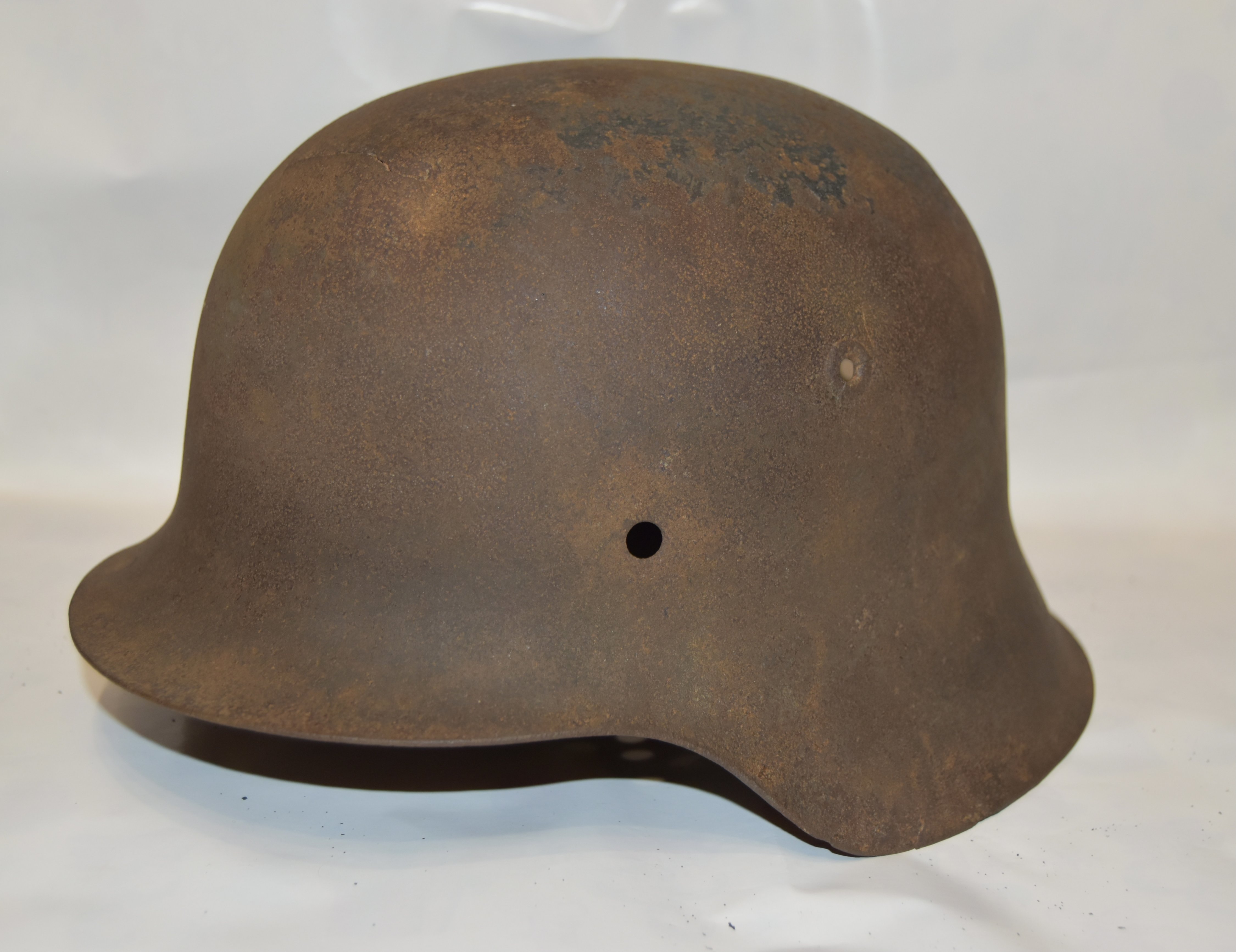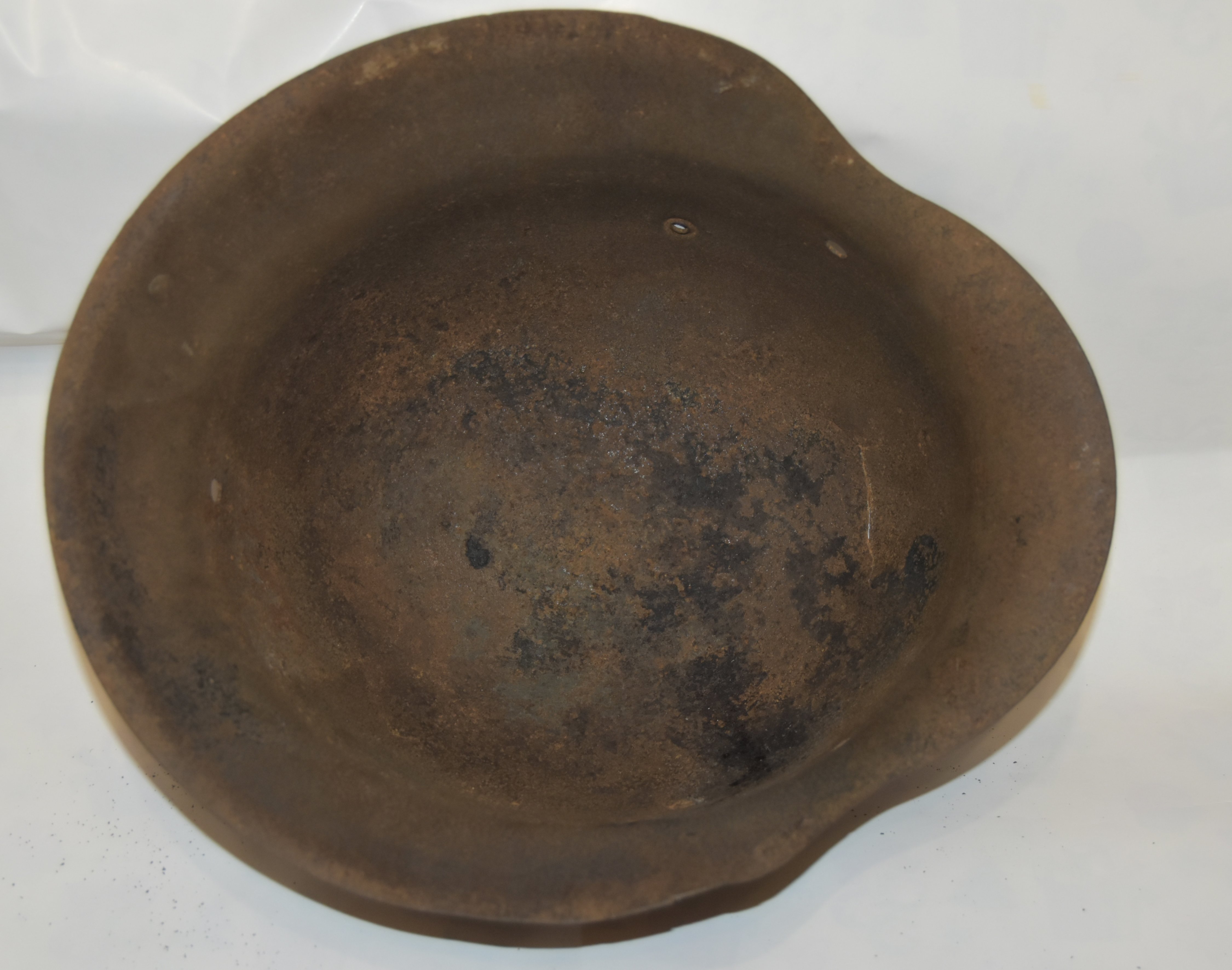 На оценку две сарайные каски 1)м-35 64 размер крепкий гладкий металл, на козырьке не хватает 9см вальца, сзади доп.отверстие. 2)м-42 64 размер тоже гладенькая крепкая , спереди на лбу трещина 4см. Кому-то интересные под реставрацию?