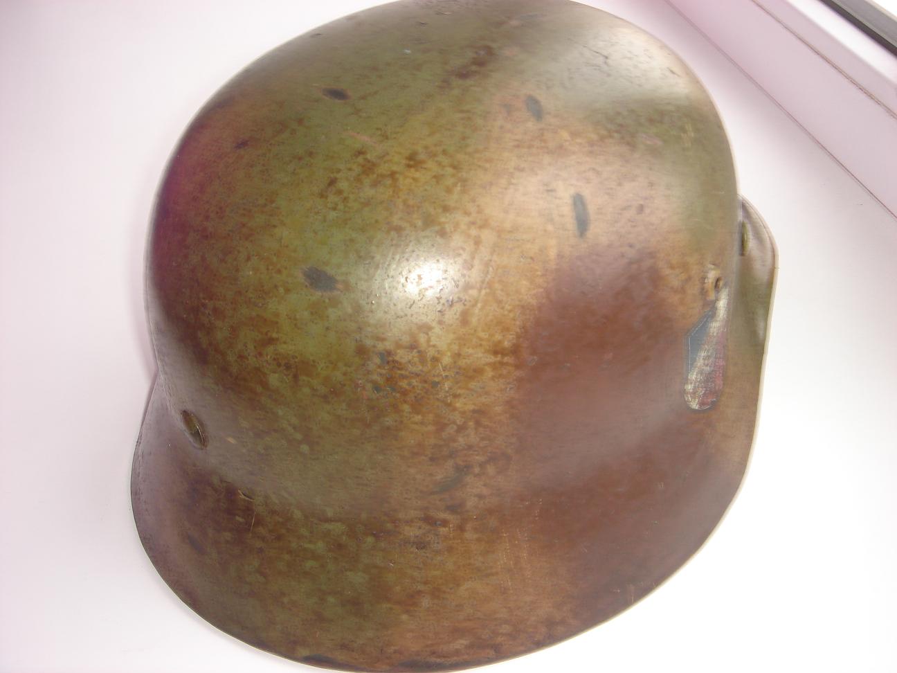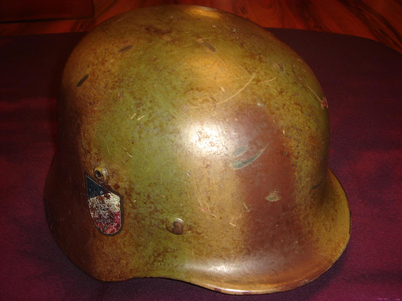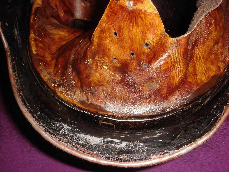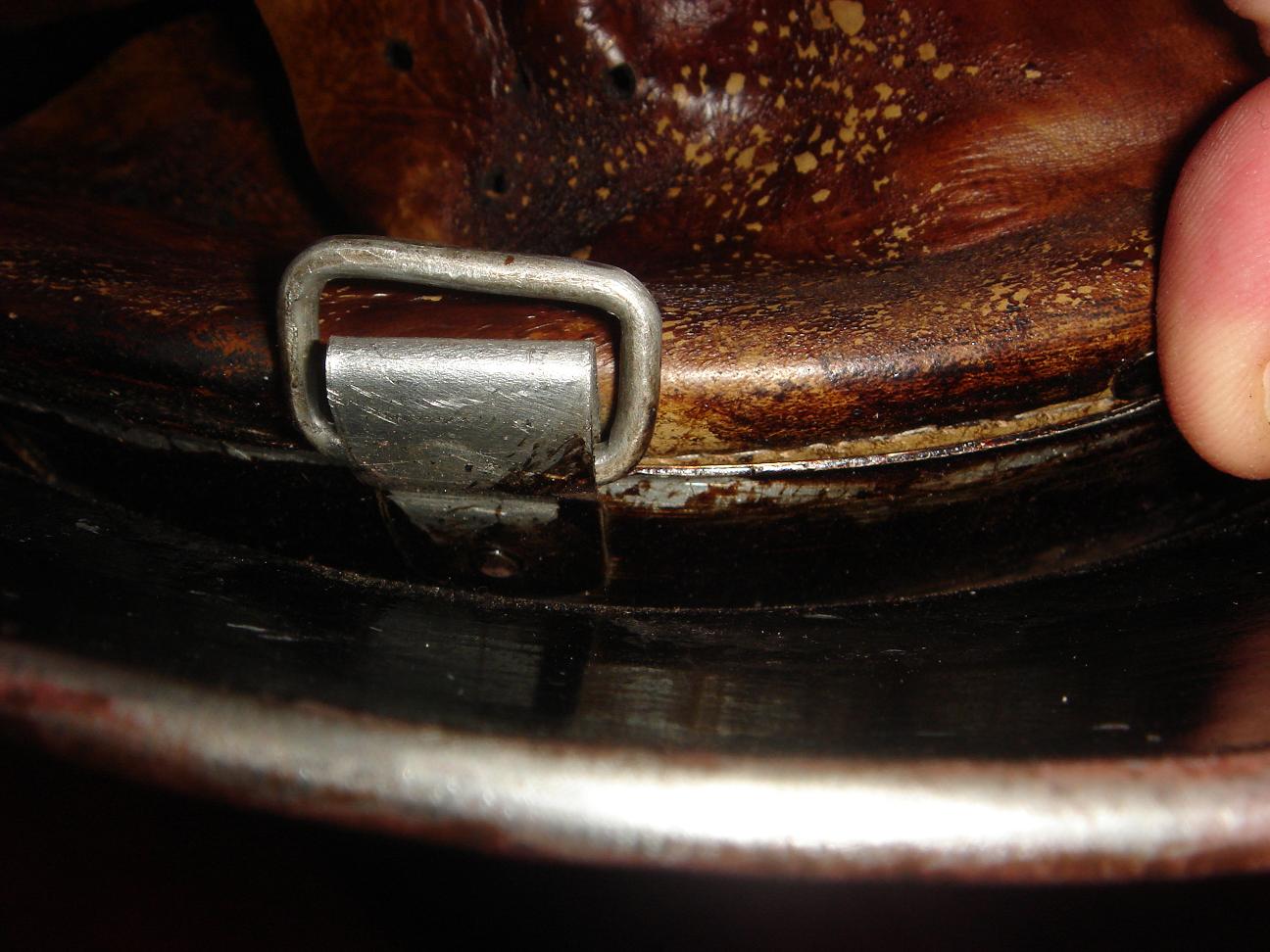 1. На настолько комплетной каске должно было бы показатся на коже хоть какое-нибудь клеймо, в частности на подбородочном ремешке - это точно. Для примера сообщу, что на моей рытой М 43 каске на ремешке сё-таки клеймо стояло, невзирая на столь познее эрзац-производство.