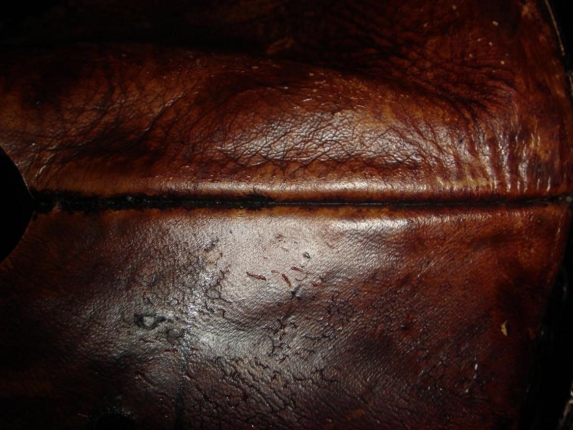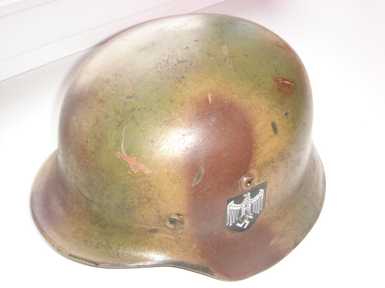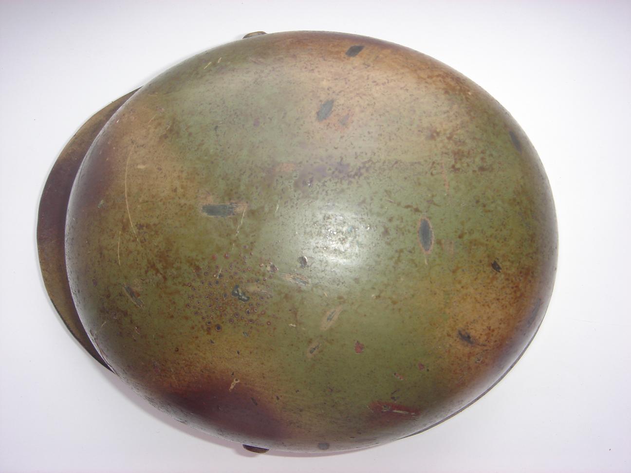 1. На настолько комплетной каске должно было бы показатся на коже хоть какое-нибудь клеймо, в частности на подбородочном ремешке - это точно. Для примера сообщу, что на моей рытой М 43 каске на ремешке сё-таки клеймо стояло, невзирая на столь познее эрзац-производство.