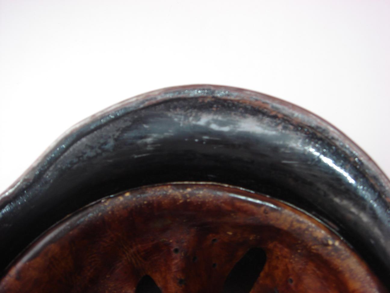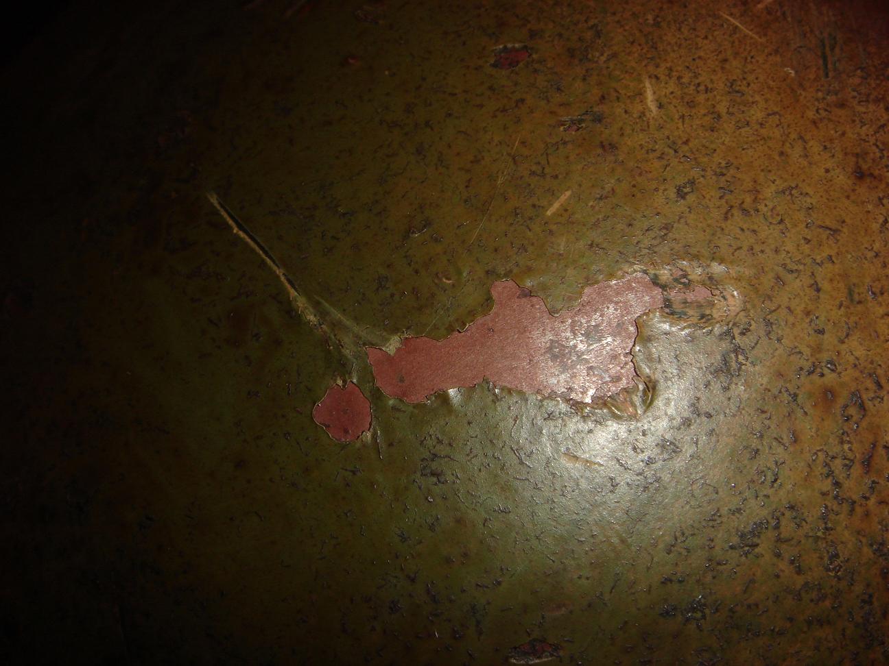 Не понятные царапины, как от наждачки на дне каски.(хотя это может и эффект от фотика)... ИМХО, кроме самого горшка, все остальное примучаный спецом новодел...