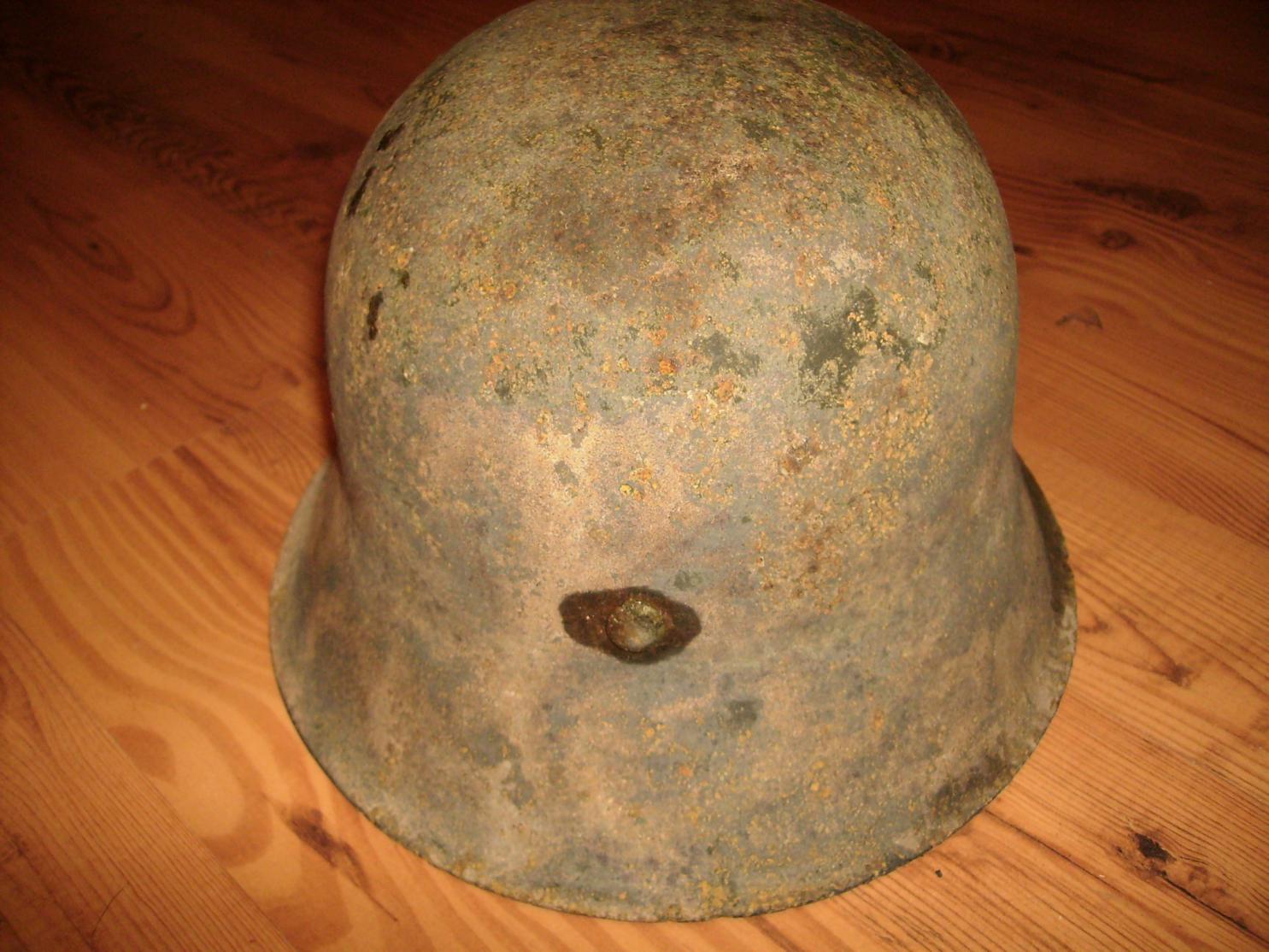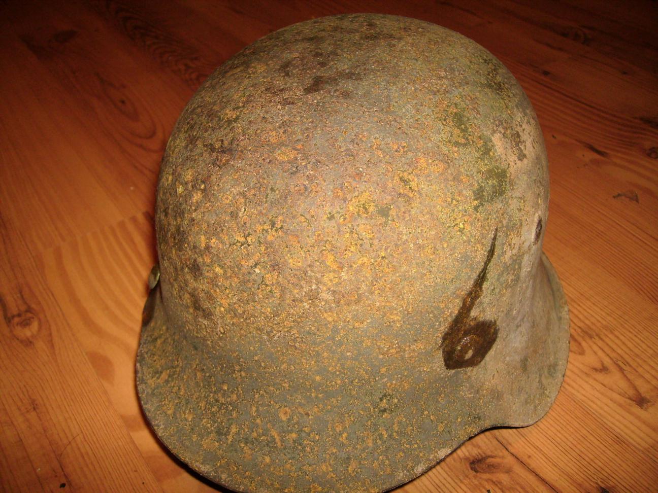 вот отмыл свежекопанную М-42, чуток в щавельке подержал. Вылезла красочка местами, каска оказалась "счастливой", сдержала пулю, трещина небольшая, этому свидетель. есть остаток декали, жаль не сохранилась. размер 64 сколько стоит такой шлем?