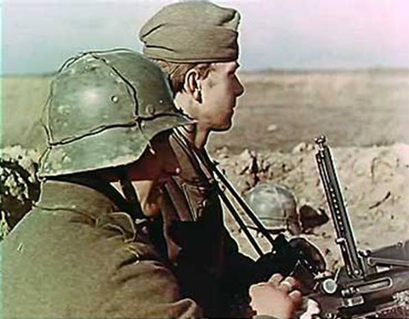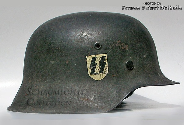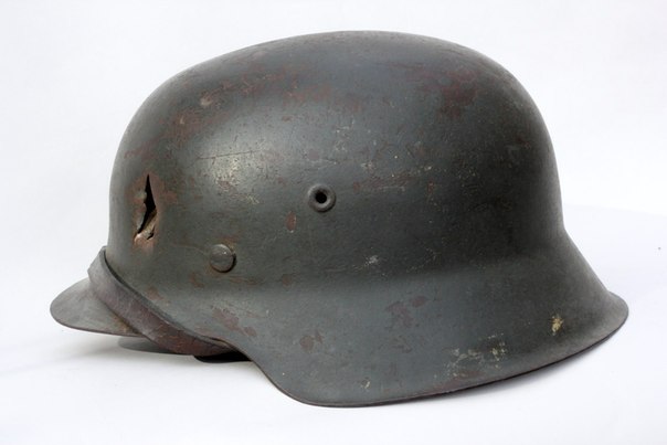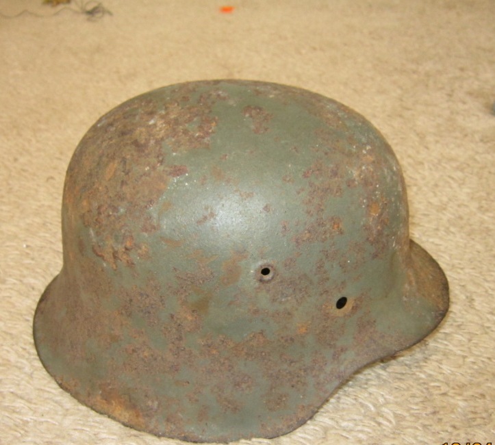"Ваш камрад видимо большой спец по окрасам М 42 - знает какие партии в какой цвет окрашивались. Все же продолжу свою мысль насчет серо-зеленых (близких к тому цвету в который вы покрасили свой шлемак.....близких, но не более того). Шлем из моей коллекции в нечастом для М 42 светлом серо-зеленом цвете (цвет близок к 6011, как я уже писал), и для сомневающихся - немецкое фото последних дней войны (апрель 1945) шлем на голове солдата и на бруствере того же нечастого зеленого (РАЛ 6011).