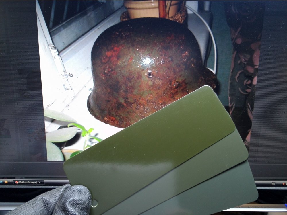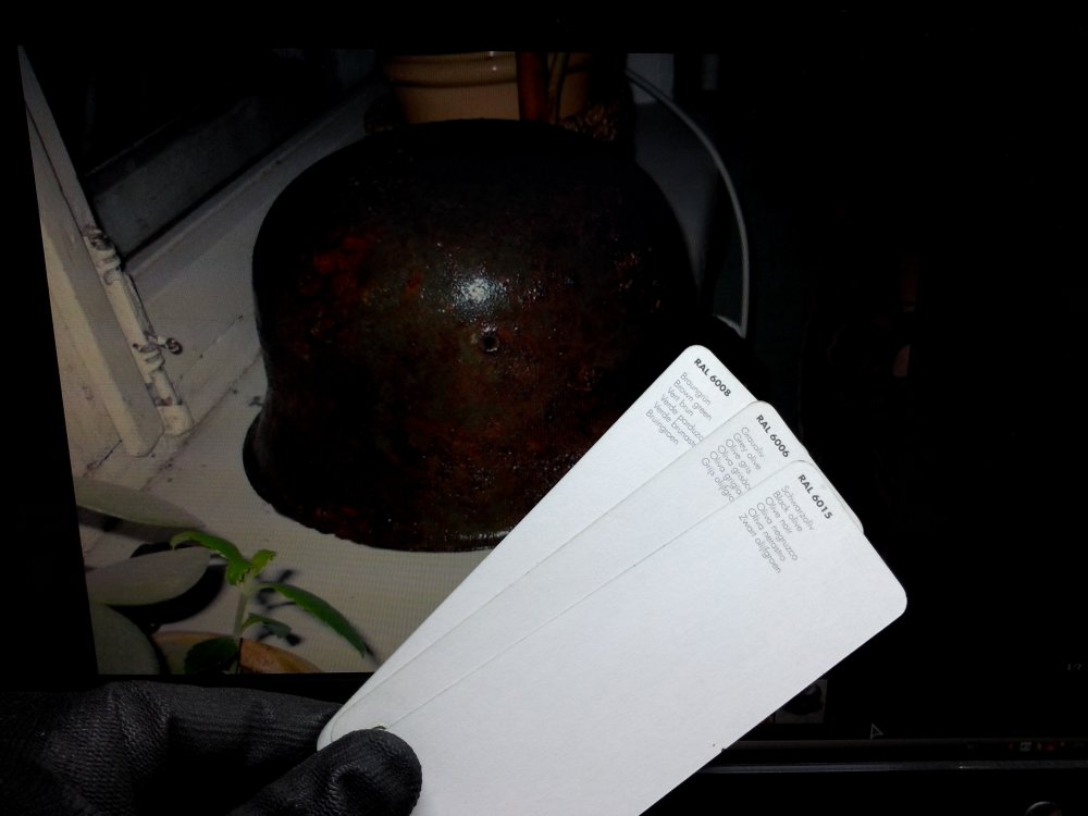 Цветные плёнки были, но это в основном в частной коллекции почти не выставляемые на просмотр. Можете взглянуть на разницу в качестве кадрах https://vk.com/video87104163_161082157?hd=2&t=7m50s В первых секундах сразу бросается в глаза качество картинки. Во вторых - фото Вашей каски понравилось. Это даже хорошо что она была смочена водой, просматривается глубина цвета и более легче его определить. Вы не пробовали сравнить этот цвет с оригинальным окрасом противогазного бачка? мне так кажется что он выкрашен в цвет RAL 6008, а также интересует если поверхностные следы перекраса?