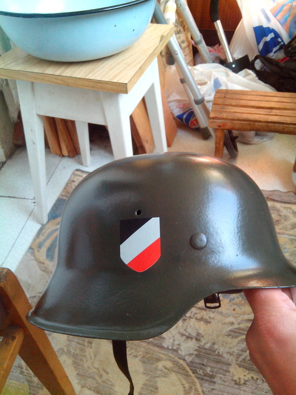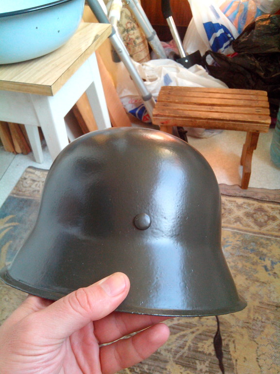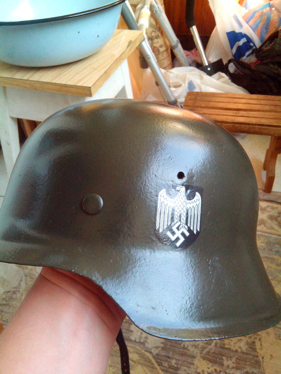 Зачем вы так категорично говорите о вещах которые просто не можете знать наверняка?! Во первых - у немцев было много цветной кино- и фотопленки, я бы даже сказал - Германия была мировым лидером в производстве цветной пленки (пример фирма Агфа) и под конец войны снимали на ней не меньше, фото которое я выложил является, насколько мне известно, стоп-кадром кинохроники апреля 1945 и явно не ретушировано - это вам подтвердит любой спец по ретушированию фото. Во вторых - основные места в окрасе на моем шлеме не подвергались воздействию ржавчины, так как не находились под ней - в доказательство фото на котором шлем "свежевыкопан" и просто вымыт водой, цвет как видите достаточно светлый серо-зеленый.