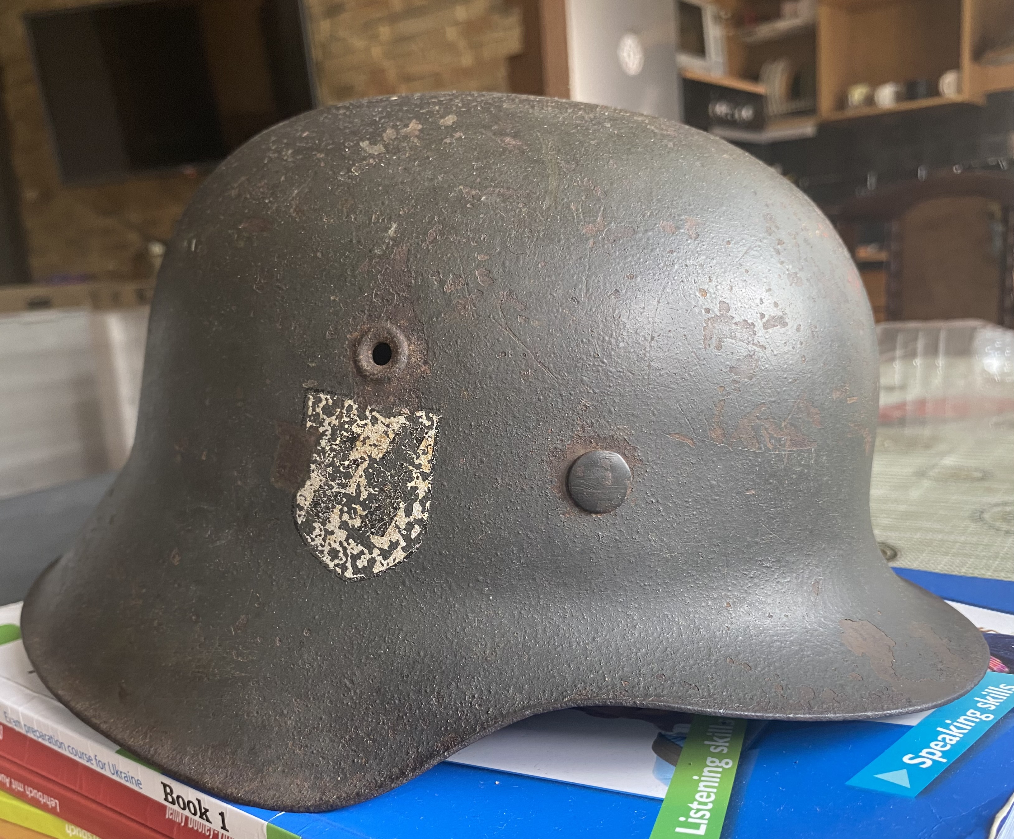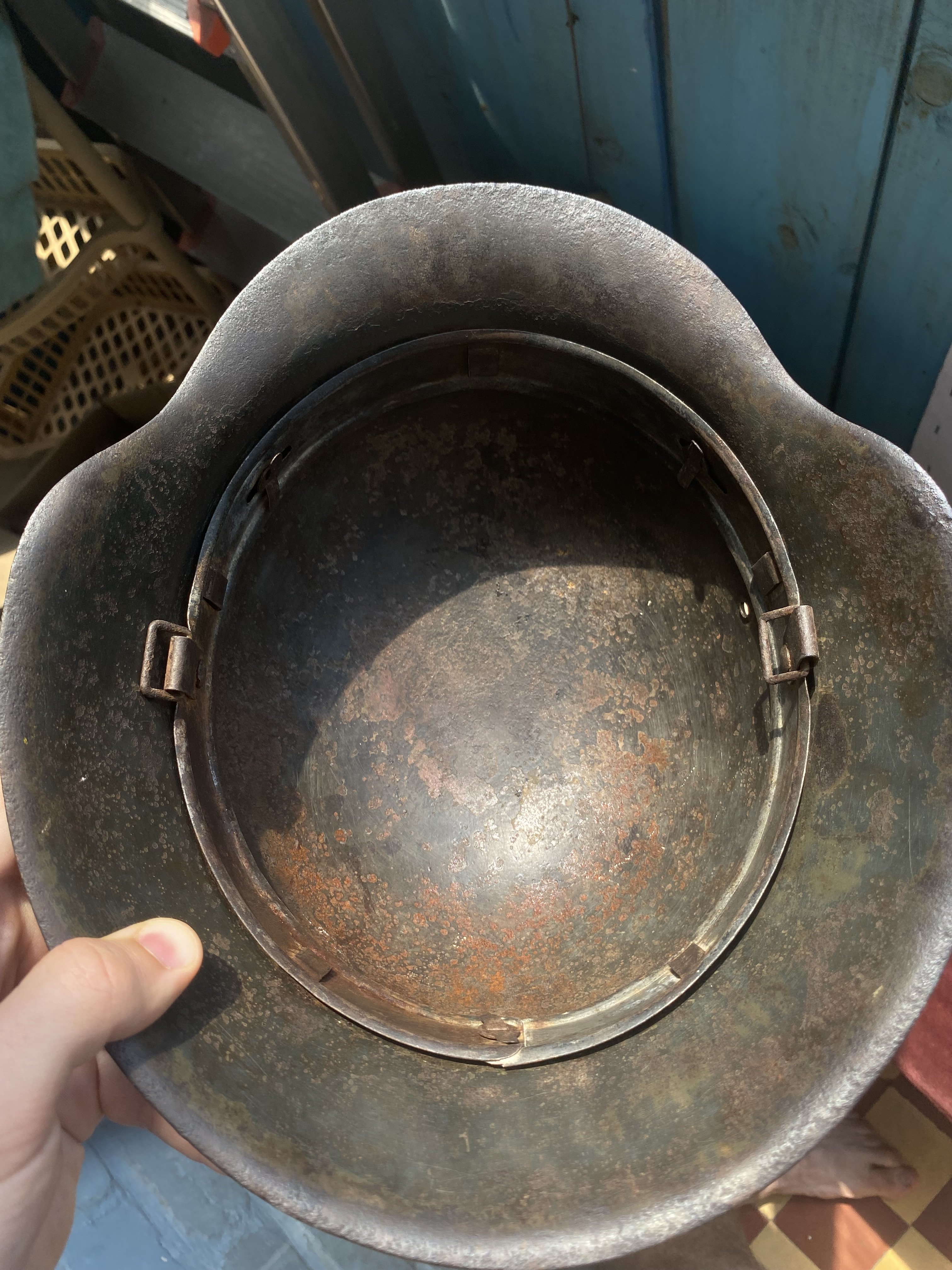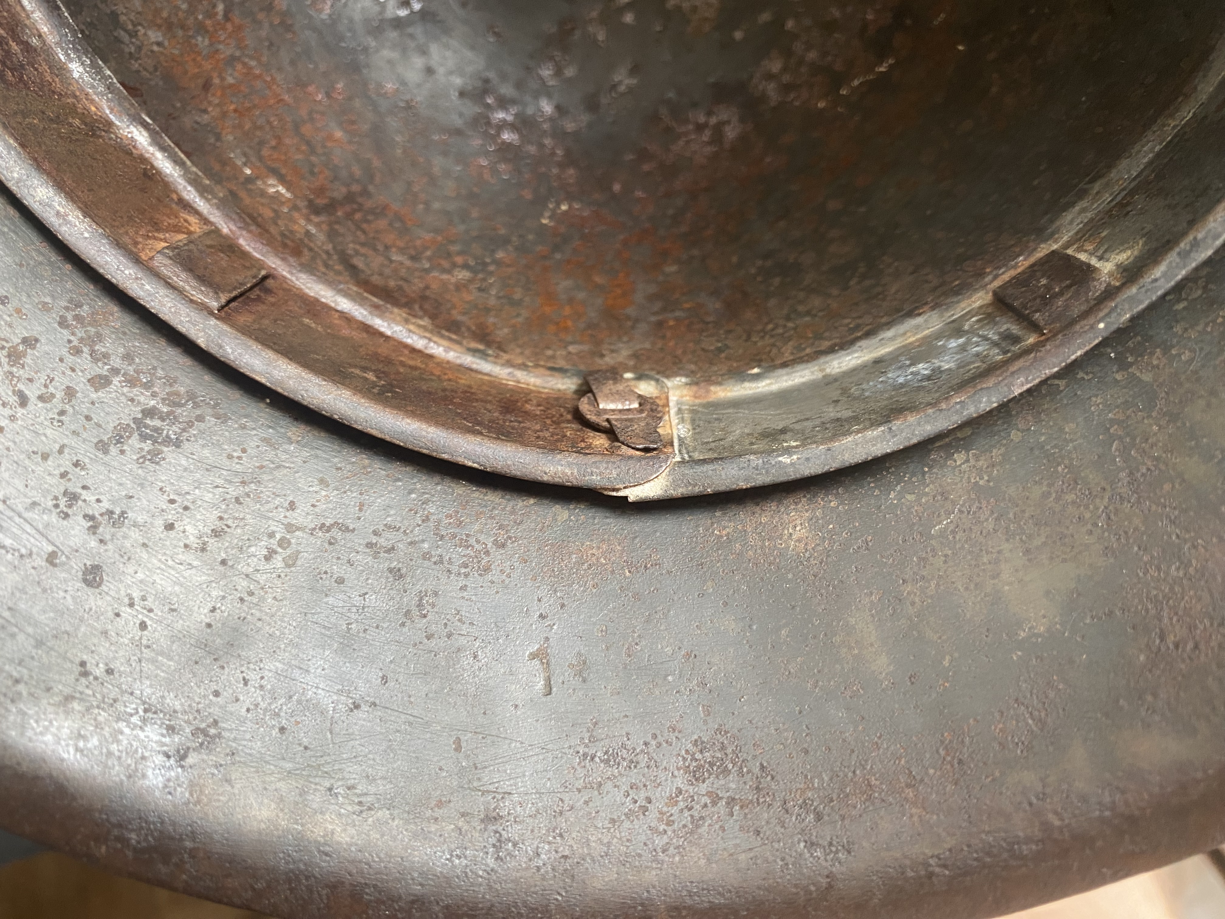 Добрый день, камрады. Заранее оговорюсь, что шлем не продаётся. Попал ко мне в руки не копанный, не кислоченный, не колхоженный М42. Всё по родне, крашен с песочком, декаль подгуляла, но все равно шлем считаю достойным. Прежде всего, интересует производитель — в затылочной части юбки выбита единица, а боковое клеймо не сохранилось. Довольно необычный вид маркировки. Мнения насчёт цены тоже выслушаю с интересом
