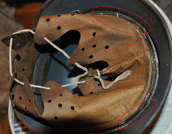 Каска сама отличная. Настораживают два момента: покраска (на фото в посте №3 очень похоже на закрашенные мелкие раковинки, возле клейма, хотя может это и просто кажется) и кожа (тут вроде все правильно, но фактура подозрительная). Подчеркиваю - эти нюансы лишь настораживают, но отнюдь не означают стопроцентного новодельства. ИМХО.
