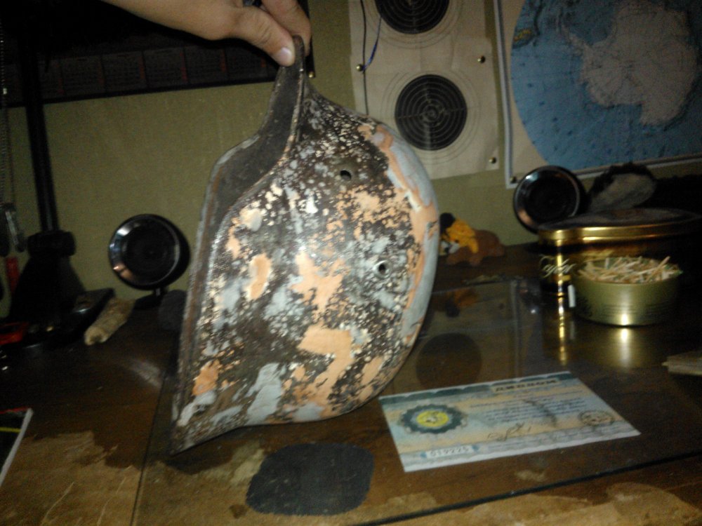 Хорошо бы фото с метром(размер узнать).Да и фото качественне сделать бы.Вальц у козырька"кусочек"самодельный? И по третьему фото похоже на самодельное вент.отверстие.Ну и клейма сфоткать(если имеются).