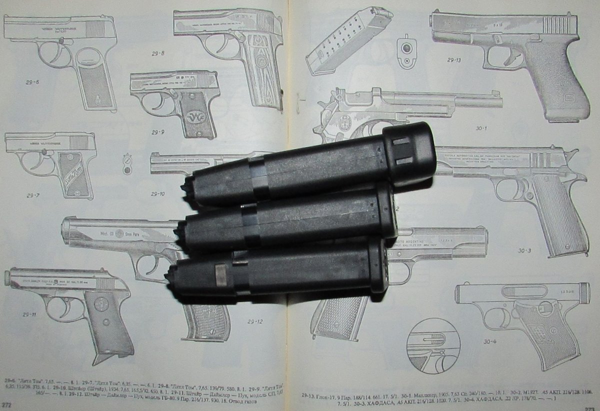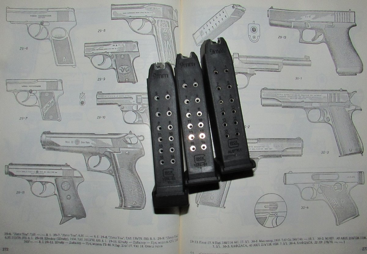 есть три новых магазина, один с большой пяткой, все на 15 патров, Глок 19й. 1500 гр. за маг.