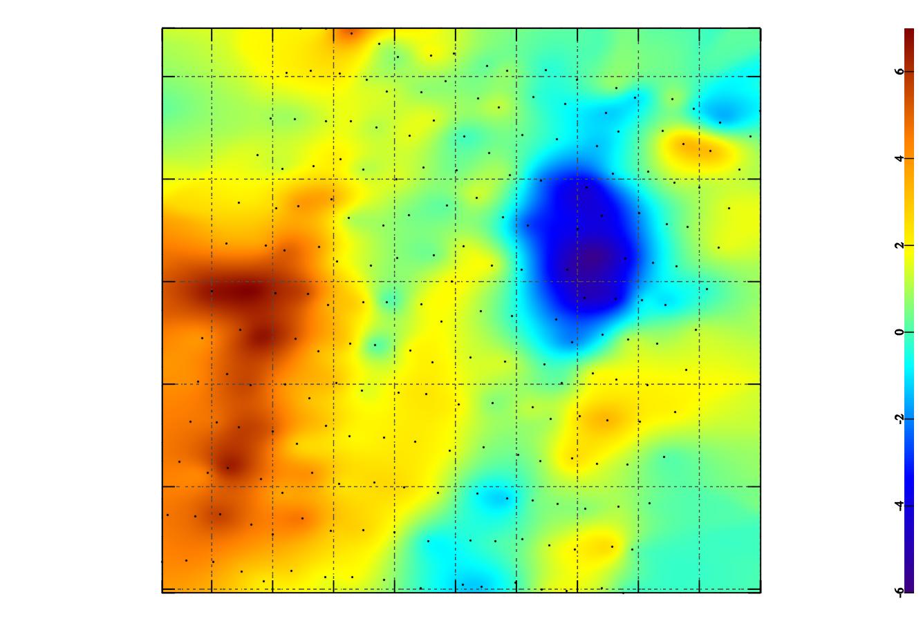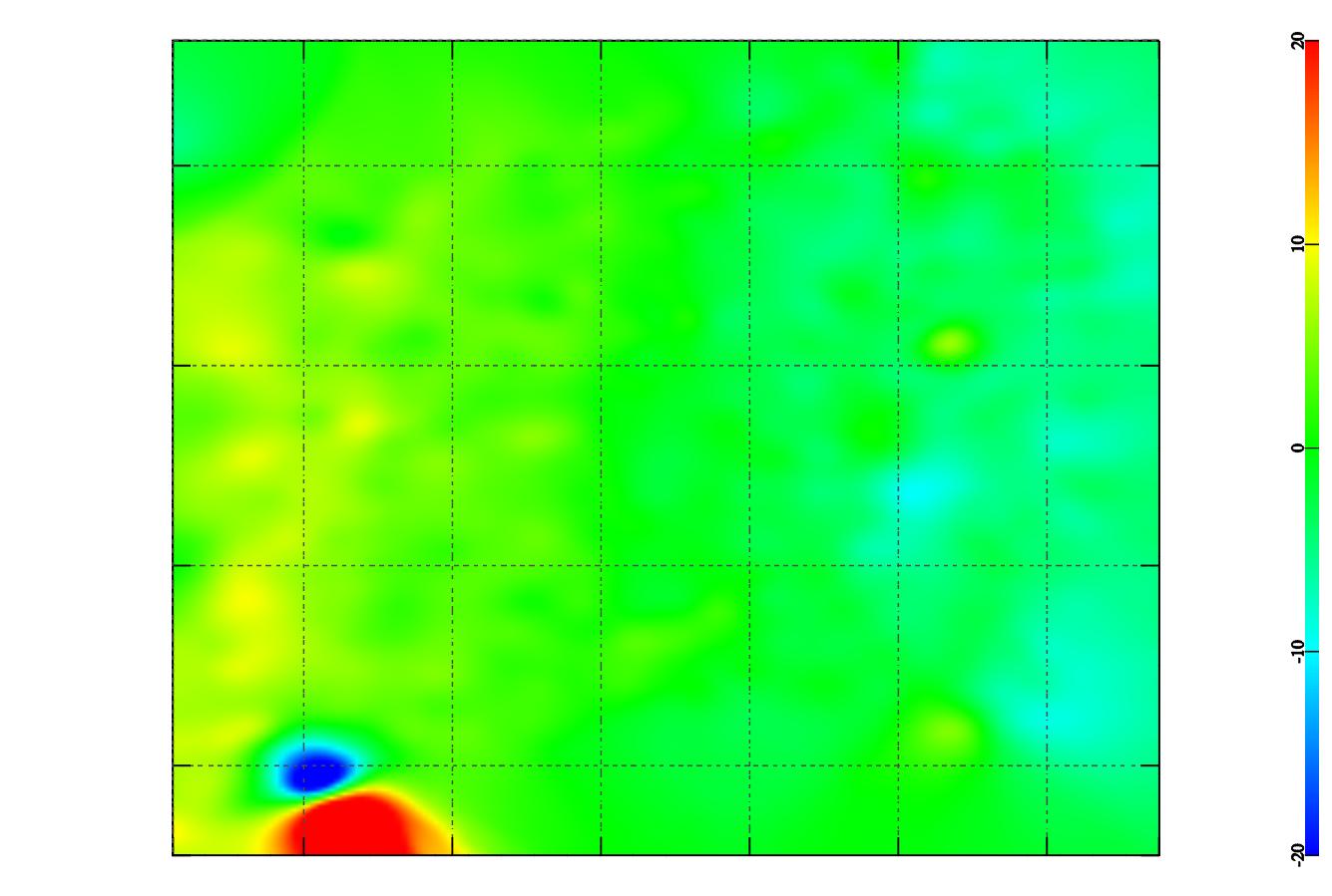 5. Ну и на закуску - карта, на которой ничего интересного нет, кроме снаряда в нижнем левом углу . Профили прокладывались с юга на север. Плавное падение поля (переход желтого в синий, слева направо) - это вариация магнитного поля земли. Количество точек 605, длительность съемки - 2 часа. Масштаб по горизонтали - 5 метров, по вертикали - 10 метров. Лишнее подтверждение необходимости использования вариационной станции при работе по слабо магнитным объектам. Теперь наши выводы по применению градиентометров. Градиентометры хороши при работе по сильно магнитным объектам. Но такие объекты прекрасно выделяются и обычными магнитометрами. При слабо магнитных объектах они ничего не покажут, там важны абсолютные показания. По результатам работы решили ввести в программу режим POI, те после обработки результатов на карте выделяются нужные аномалии. Их координаты записываются в магнитометр. Тк в магнитометре есть компас и GPS, то с помощью встроенной навигации производится точный выход на интересующие нас точки. Проверка показала, что точность выхода на точку 0,5 - 1 метр.