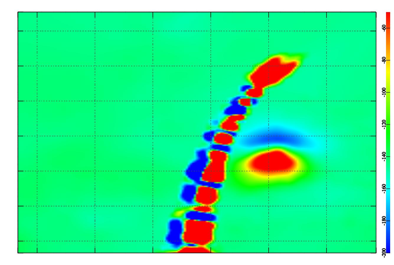 3. Самые интересные результаты - работа по археологии. Прибор - тот же,с оверхаузеровским датчиком и GPS привязкой. Вообще, встроенный канадский приемник показал очень неплохие результаты. При заявленной абсолютной точности 1,5 метра, благодаря алгоритмам обработки, возможно вести съемку с густотой сети измерений 0,5 метров, те при небольшой скорости движения оператора получалось различать точки измерений. На картинке - часть подземного хода, он идет вертикально (слабо голубой цвет), с юга на север. Голубая аномалия - место провала. Масштаб по горизонтали - 2 метра, по вертикали - 5 метров. 221 точка измерения, длительность проведения измерений - 1 час. К сожалению, второго вариационного прибора не было, тогда бы качество съемки было бы еще выше. Датчик находился на высоте 1,8 метров над уровнем земли. Так как земля была несильно замусорена железом, в будущем решили на этом объекте опускать датчик к земле. Объект - катакомбы на глубине 8 метров.