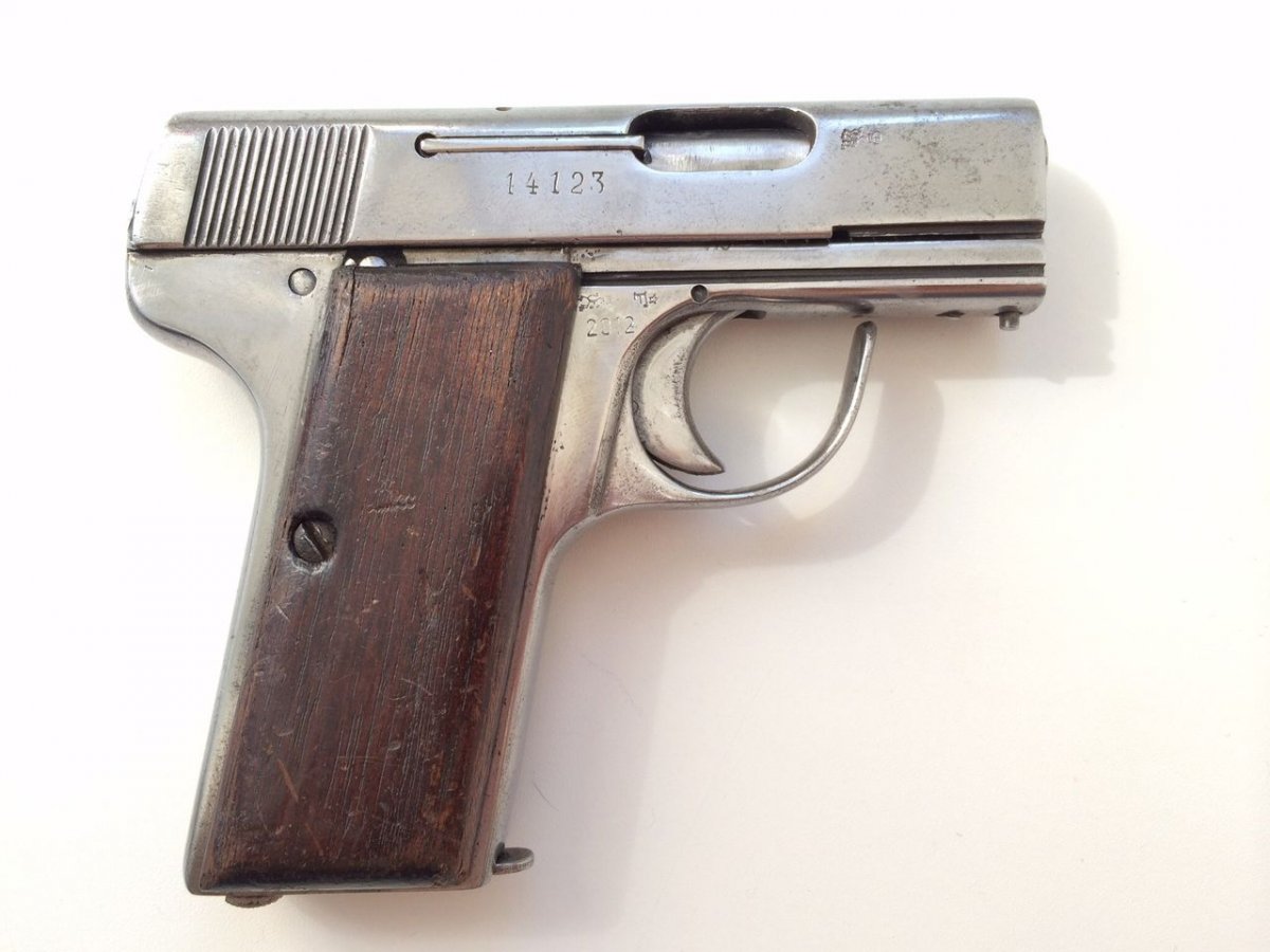 это Бергманн или Лигнозе мод. 2а, разработанный для использования только одной рукой. Видимо у вашего деталь, которая отвечает за взвод затвора утеряна, а ее нижняя направляющяя загнута вверх к затворной раме - получилась просто спусковая скоба.