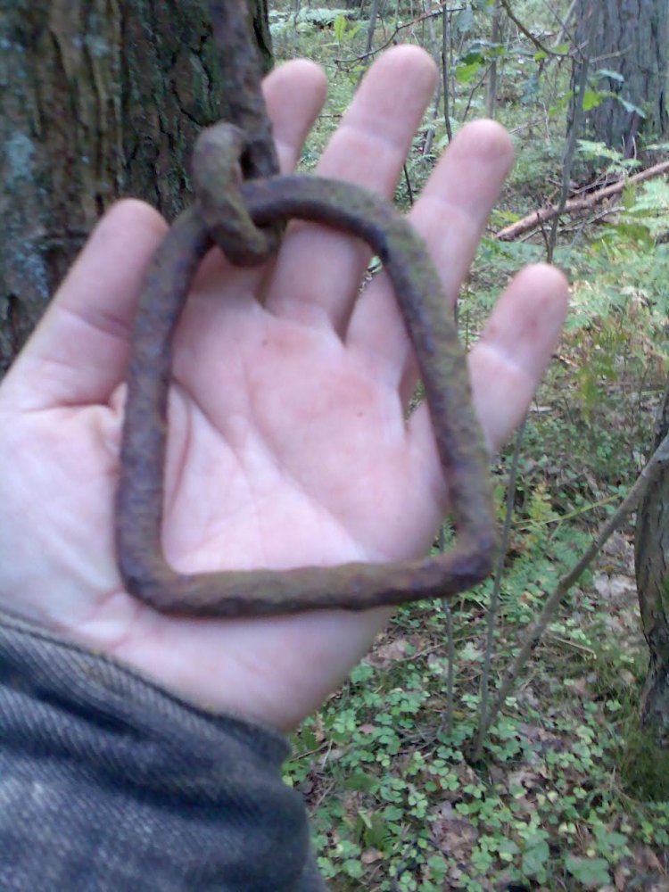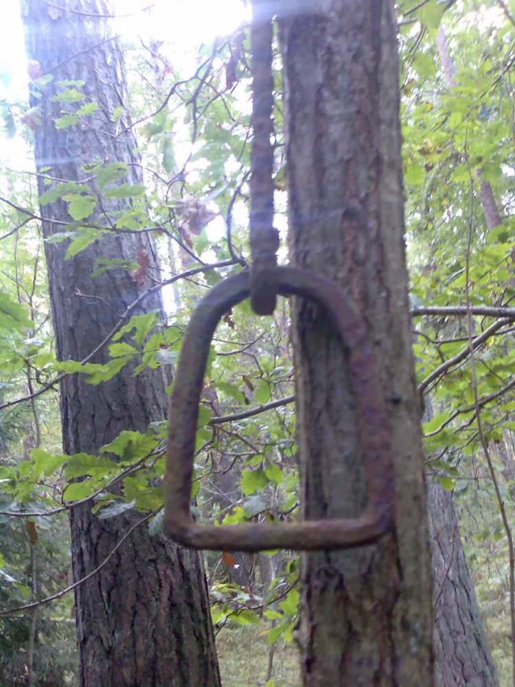 Вот такая кованная железка висела на дереве. Для стремени очень маленькая. Может для детской ноги? Рядом остатки противогаза и ВОП.