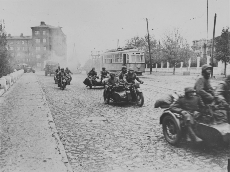 Вітаю! Фото підписано: Німецькі мотоциклісти і вантажівки на проспекті Ілліча у захопленому Маріуполі (1941 р.?) [у назві файлу присутня дата 1941 - MarAlex]