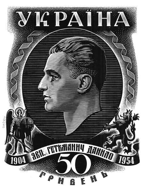 Марка на прославу гетьманича Данила Скоропадського. Мистецька робота Віктора Цимбала, знаного художника, в юності - вояка Армії УНР.