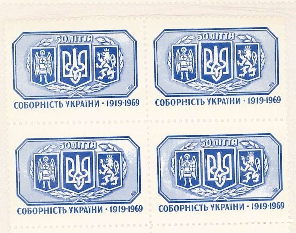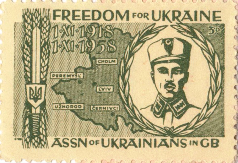 Марка, присвячена 40-річчю «Листопадового чину» із зображенням керівника повстання Дмитра Вітовського. Велика Британія. 1958р.