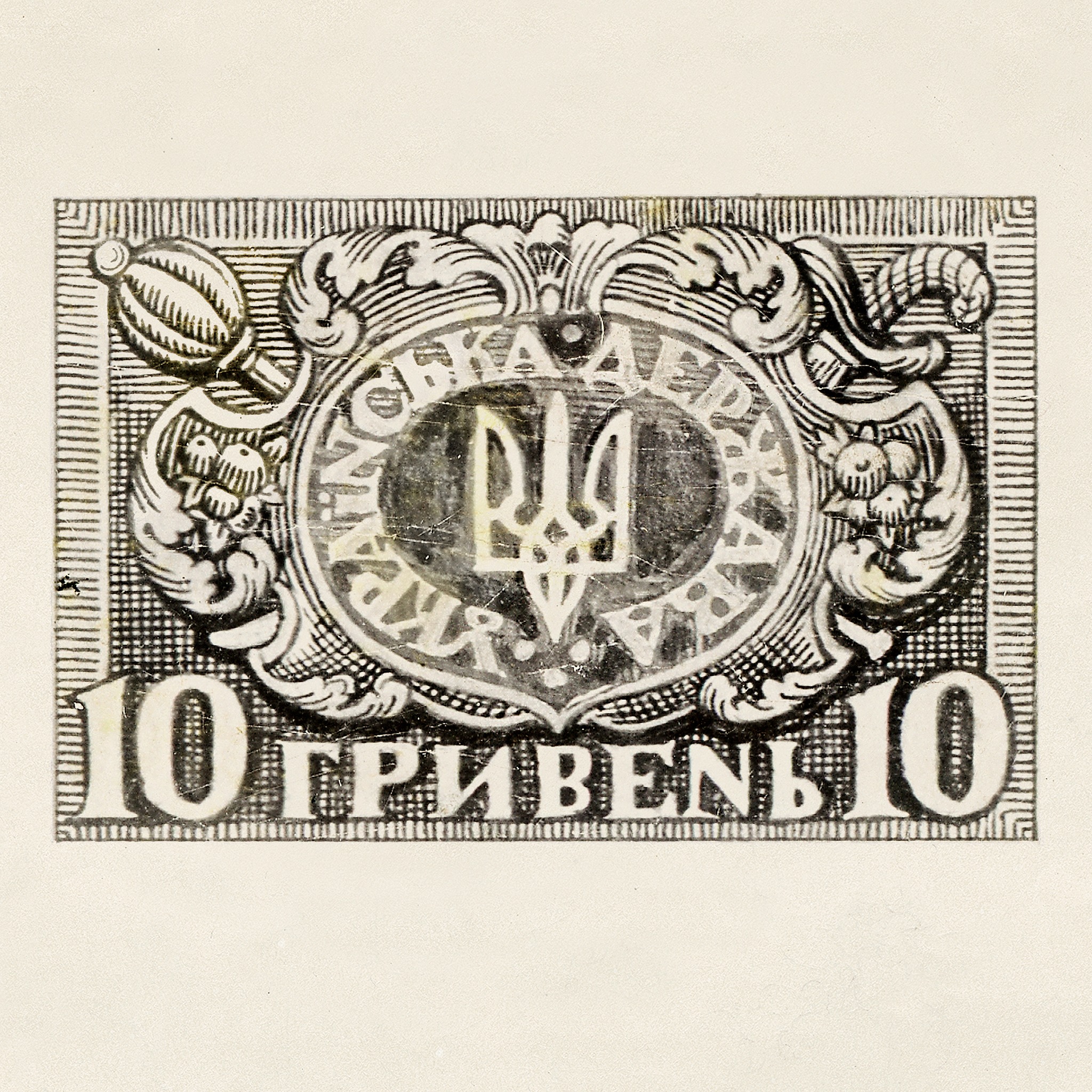 Проект поштової марки номіналом 10 гривень. Українська Держава. 1918р. Із матеріалів Експедиції заготовок державних паперів, що діяла при Міністерстві фінансів України впродовж 1917–1921 років. Фото ескізу зберігається в Центральному державному архіві вищих органів влади та управління України.