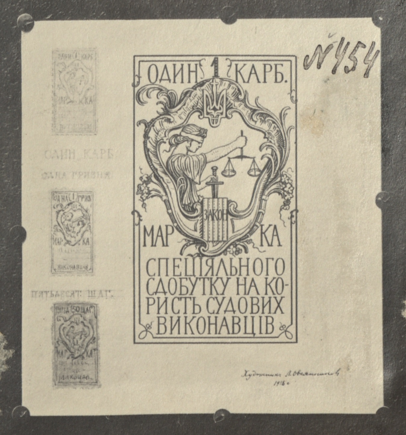 Ескіз марки номіналом 1 карбованець про оплату збору на користь судових виконавців. Українська Держава. 1918р. Із матеріалів Експедиції заготовок державних паперів, що діяла при Міністерстві фінансів України впродовж 1917–1921 років. Фото ескізу зберігається в Центральному державному архіві вищих органів влади та управління України.