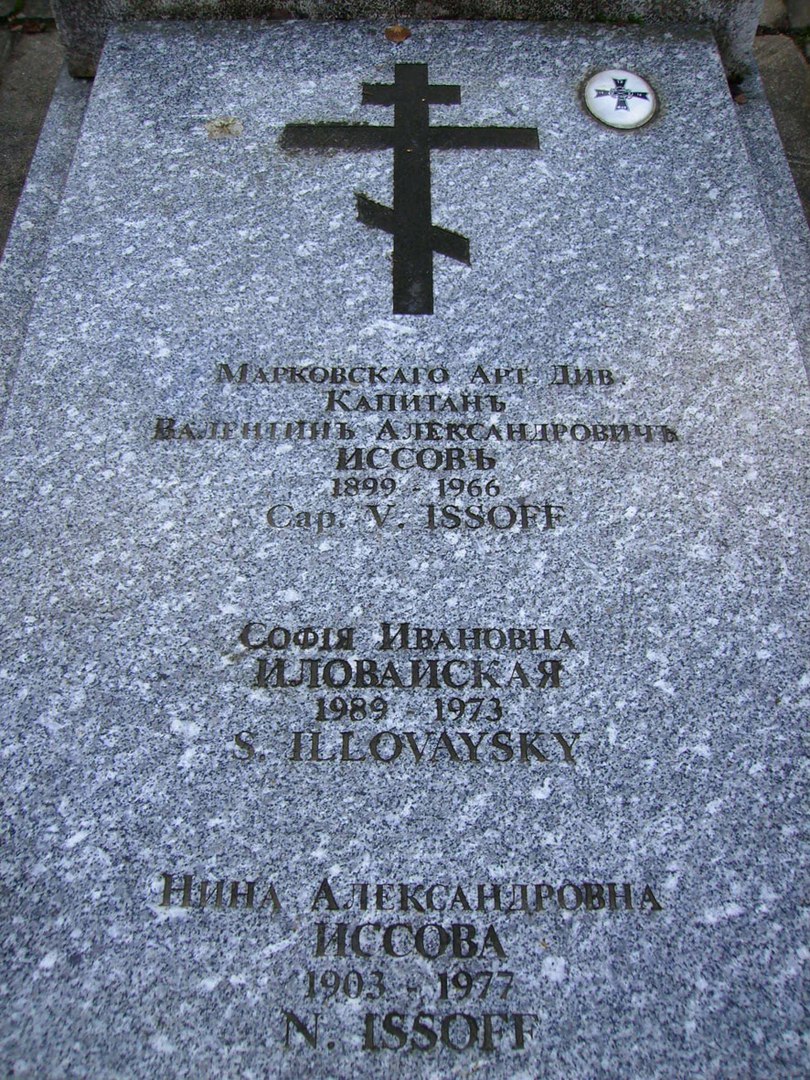 Капитан Марковского Артдивизиона Иссов Валентин Александрович. Родился в 1899 в Осовец (Польша). Его отец - Начальник госпиталя крепости Осовец Иссов Александр Вениаминович, 1876 г.р. был расстрелян в Керчи в 1920-м году, "как виновный вследствие непролетарского происхождения и социального положения". Валентин учился во Владимирском и Киевском кадетских корпусах , окончил последний в 1917, юнкер Константиновского артиллерийского училища. В Добровольческой армии с ноября 1917 в Юнкерской батарее, с 12 февраля 1918 прапорщик. Участник 1-го и 2-го Кубанских походов: февраль-март 1918 в 4-й, затем в 1-й офицерской батарее, ранен 28 марта 1918. На 21 марта 1919 в 1-м легком артиллерийском дивизионе. Награжден Георгиевским крестом 4-й степени. Во ВСЮР и Русской Армии в Марковской артиллерийской бригаде до эвакуации Крыма (сентябрь 1920 в 1-м дивизионе). Штабс-капитан. Галлиполиец. В эмиграции во Франции. Скончался 14 июня 1966 в Париже. Похоронен на галлиполийском участке на кладбище Сен-Женевьев-де-Буа.