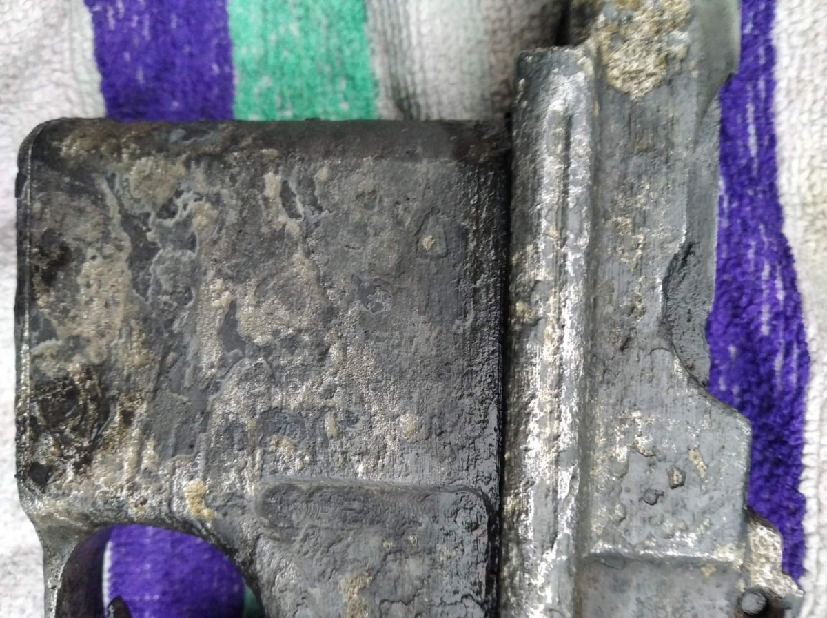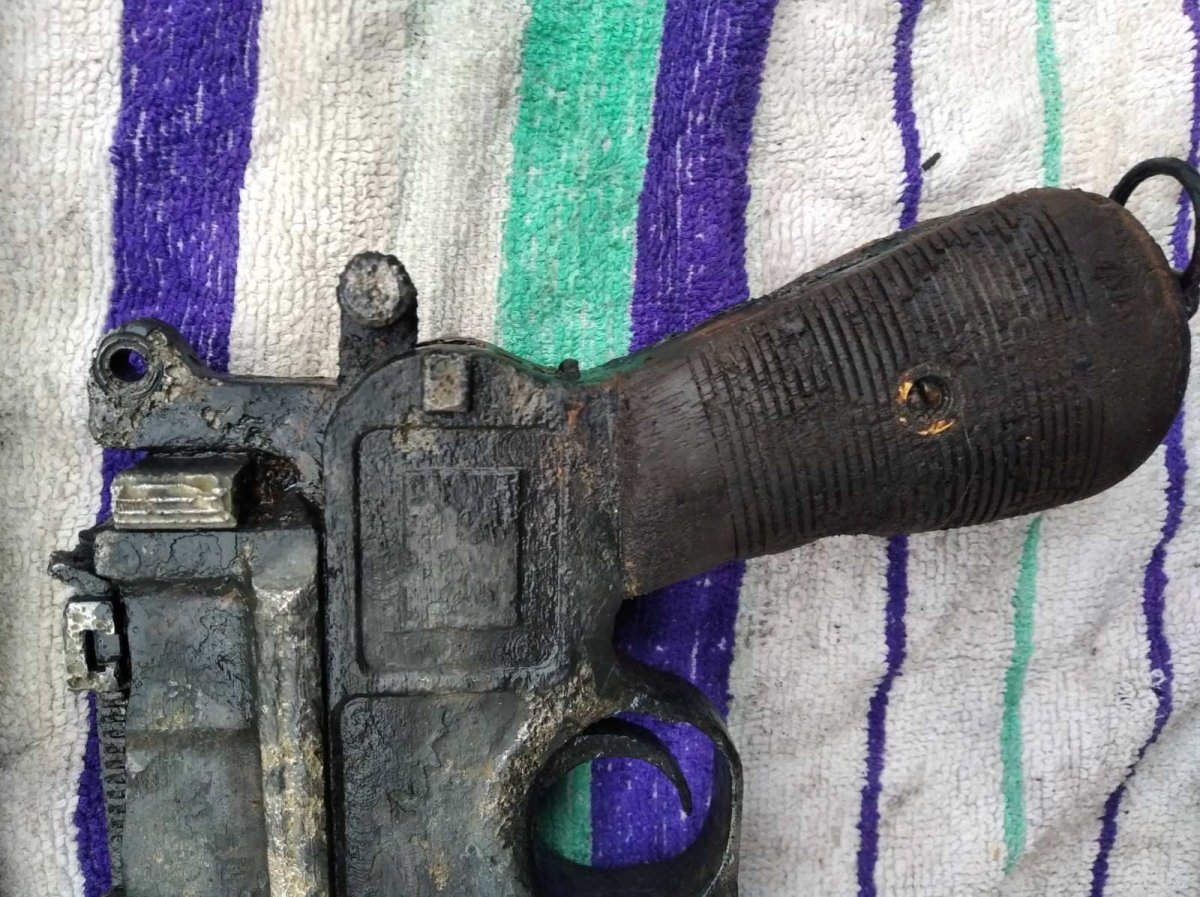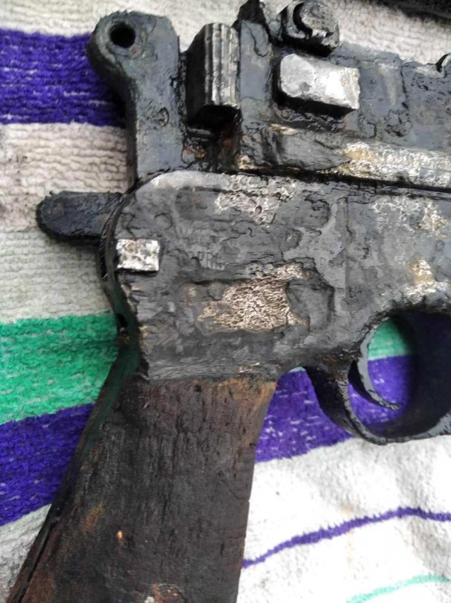 Помогите предварительно оценить свеже найденый девайс для последующей возможной продажи. Металл весь крепкий без глубокой коррозии. На коробке с одной стороны видны небольшие свищи. Поднят с дна озера- из ила. Не торф. Сверху немного очистил щеткой по металлу. Разрабатывать не хочу. Кобура без трещин родная (кнопка и шарнир движется четко ) но хранится в воде дабы не высохла и не рассыпалась. 2.jpg 2.jpg 2.jpg 9.jpg