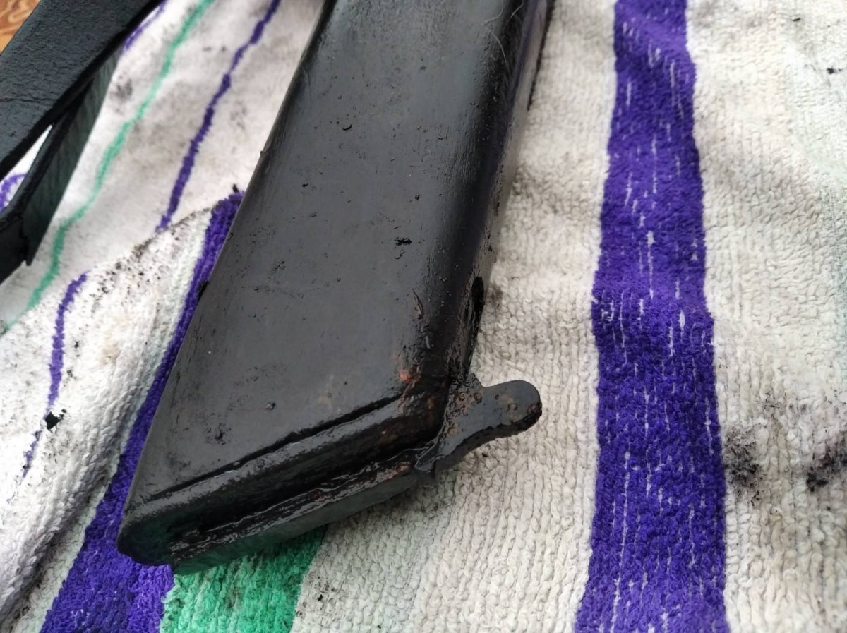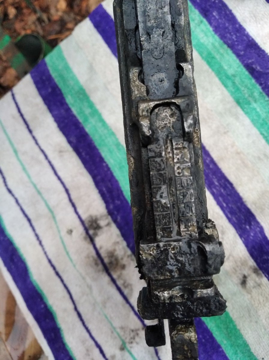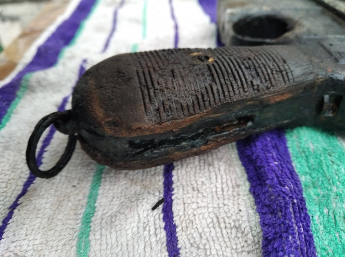 Помогите предварительно оценить свеже найденый девайс для последующей возможной продажи. Металл весь крепкий без глубокой коррозии. На коробке с одной стороны видны небольшие свищи. Поднят с дна озера- из ила. Не торф. Сверху немного очистил щеткой по металлу. Разрабатывать не хочу. Кобура без трещин родная (кнопка и шарнир движется четко ) но хранится в воде дабы не высохла и не рассыпалась. 2.jpg 2.jpg 2.jpg 9.jpg