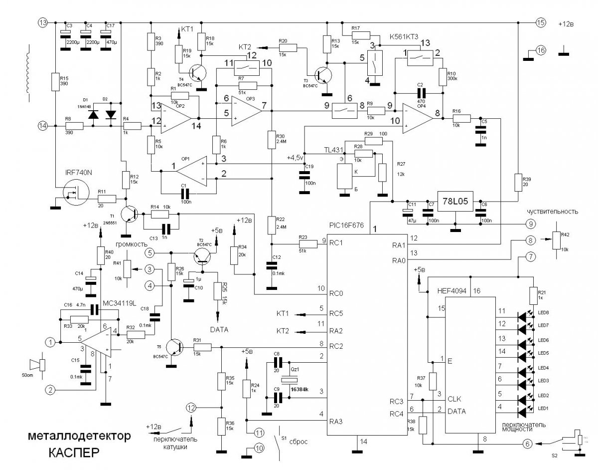 Для пошуку металолому потрібний все таки хороший імпульсник. За останні роки я перепробував їх практично всіх. На мою думку, найкраще для цього підходить "Каспер". До війни ці набори клепали в Макеївці, але і зараз можна найти якщо добре пошукати. Його включав сантиметрів 30-40 над консервною банкою, натискав RESET і він вже менших предметів не бачив, при цьому чуйка зовсім не зменшувалась. Ось для ознайомлення його схема.