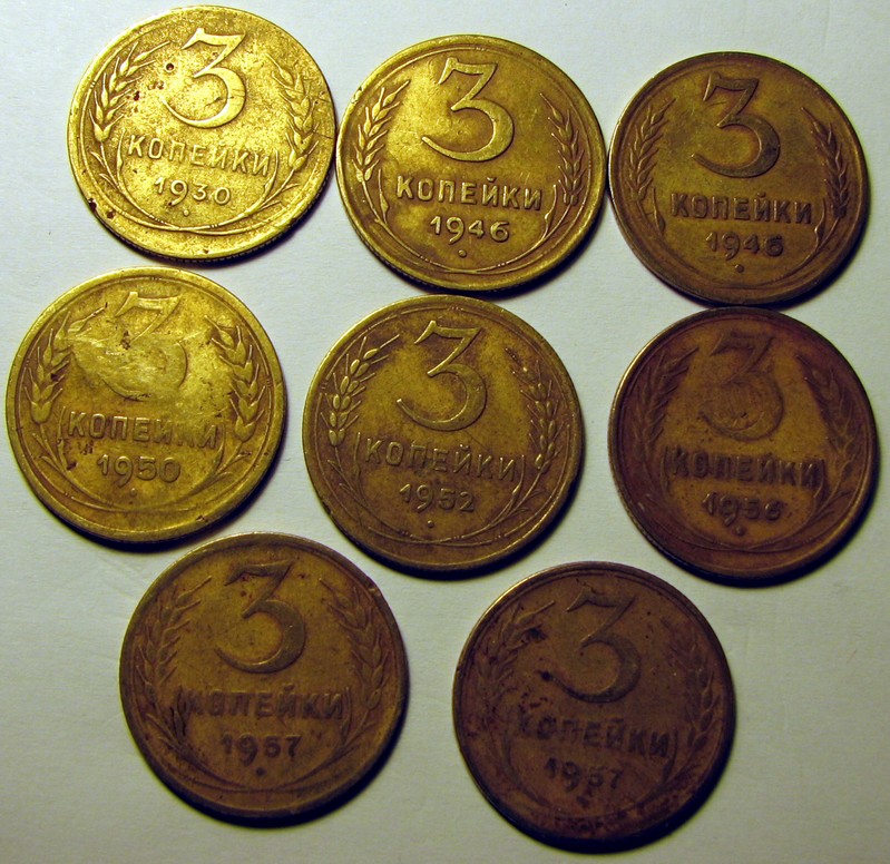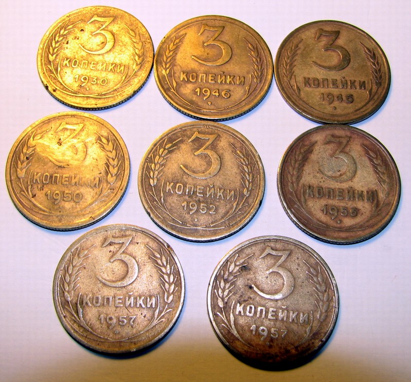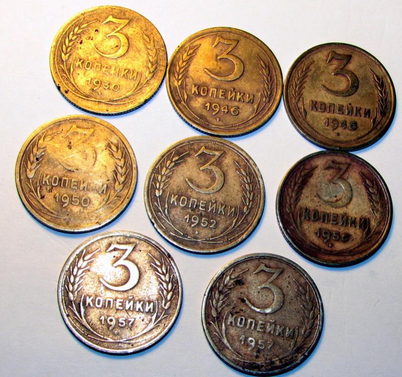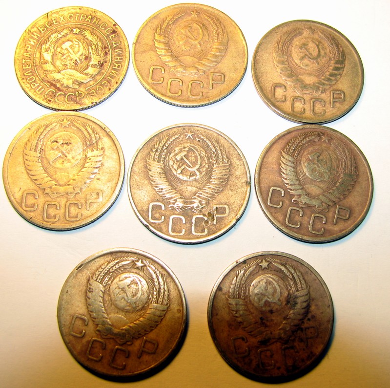 Первые монеты СССР номиналом 0,5-1-2-3 коп выпускались из меди 1924,25 гг. Алюминиевая бронза 1926-35,потому эти монеты даже в чернозёме практически не поддаются коррозии. Медно-цинковый сплав 1958-1991 включительно.