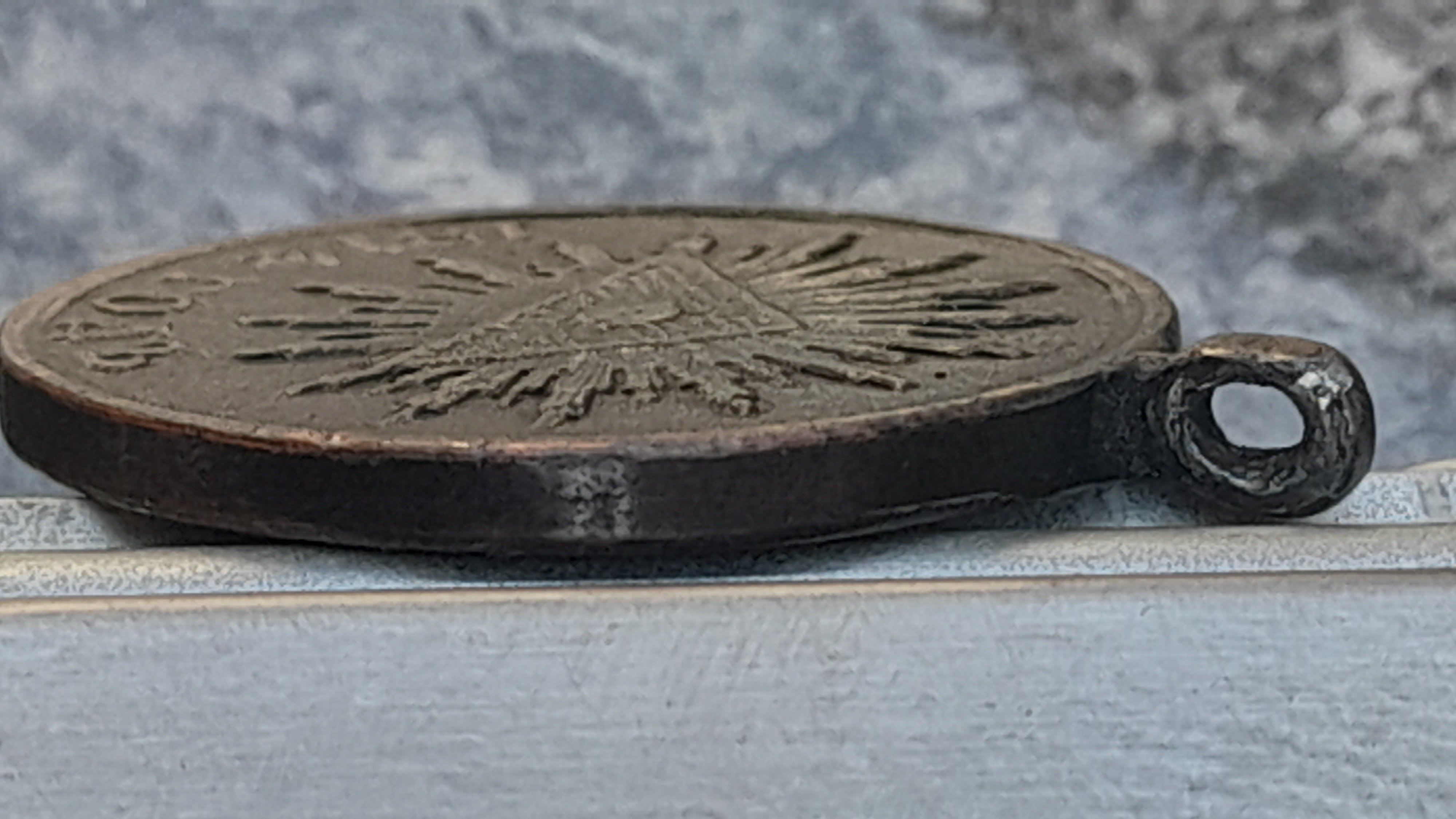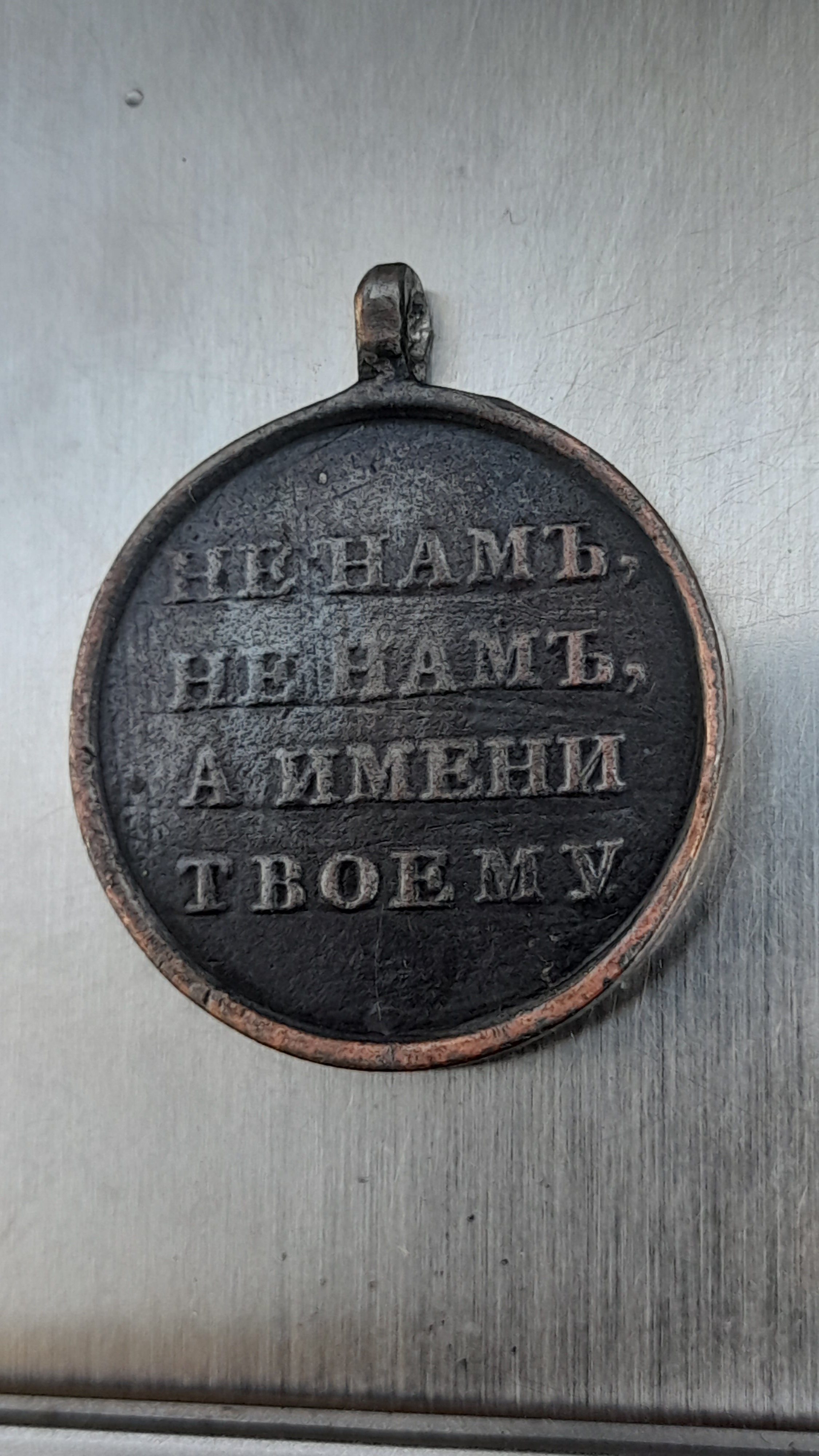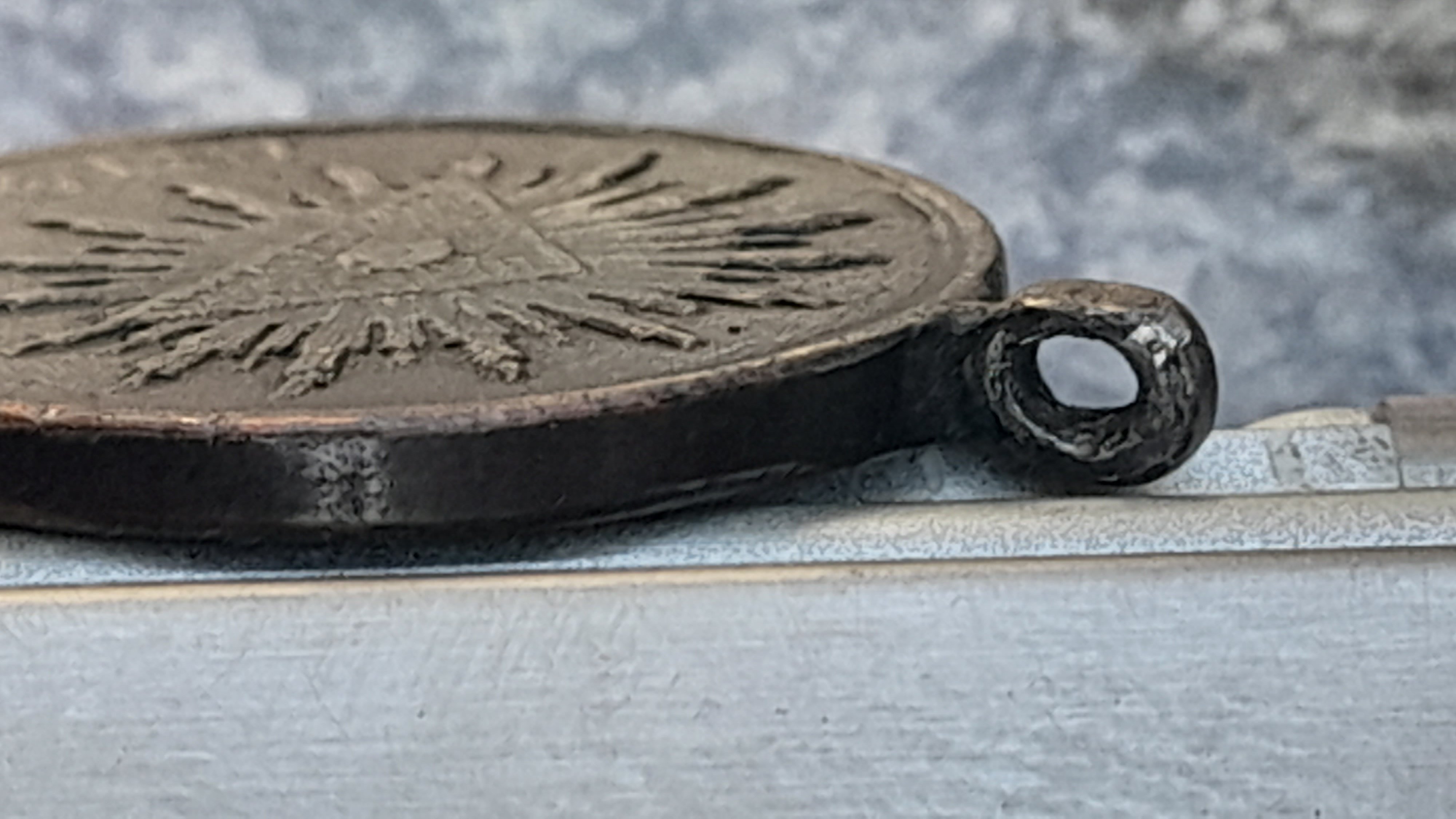 Извольте дополню - в уважаемого камрада,это разновидность (выдержка с вики) "...Были изготовлены подобного рода серебряные медали и меньшего размера (диаметром не 28, а 22 мм) с поперечным ушком и продетым в него колечком для подвешивания на ленту. Такие медали носили кавалеристы..." Тов Burat78, если есть возможность и желание, можете замерять штангелем . С уважением Николай.