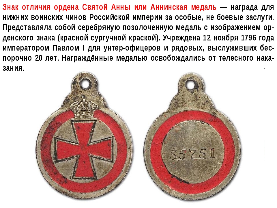 Знак отличия ордена Святой Анны - https://ru.wikipedia.org/wiki/Знак_отличия_ордена_Святой_Анны http://goodcoins.su/ordena/annenskiemedali.htm http://medalirus.ru/anenskaya-medal/