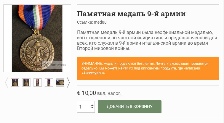 Медаль, посвященная кампании 9-й армии в Греции и Албании (Medaglia Memorativa della 9a Armata Campagna Greco-Albanese), 1940-1941 Круглая бронзовая медаль с проушиной и замененной петлей для подвешивания ленты; лицо с рельефной картой Юго-Восточной Албании с топонимами в пределах круглой Лавровой границы, итальянская корона вверху, надпись "9А Армата" внизу на фасции и полевая пушка, узлы по обе стороны, окруженная "CAMPAGNA DI GRECIA E JUGOSLAVIA 28 OTTOBRE 1940 – 23 APRILE 1941 – XIX" (кампания Греции и Югославии 28 октября 1940 – 23 апреля 1941 -19), подпись "P MORBIDUCCI" у основания; реверс с коронованным двуглавым албанским орлом, окруженным каймой из узлов, с надписями "MIK ME KRYE ME BESE E BURRNI" и "AMICO FINO AL SACRIFICIO CON FEDE E CORAGGIO" (по-албански и по-итальянски "прекрасные друзья жертвоприношения с верой и мужеством"), разделенными дубовыми листьями; на правильном бумажном изображении ленты. Медаль была создана в 1941 году для 9-й армии, которая была сформирована в ноябре 1940 года под командованием генерала Марио Верчеллино для службы в Албании. Армия заняла район Охридского озера, прошла зимовку юго-восточнее тираны и 13 апреля 1941 года приняла участие в наступлении на Грецию. Атака была вскоре отбита греческой армией, что потребовало германского вмешательства на итальянской стороне и вызвало решающую задержку немецкого вторжения в Россию летом 1941 года.