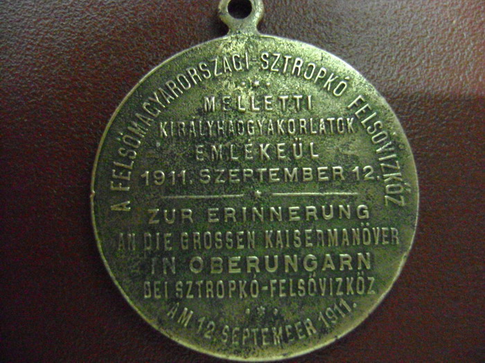 Памятная медаль о больших военных императорских манёврах, которые проходили в Верхней Венгрии 12 сентября 1911 года и на которых присутствовал император Австро-Венгрии Франц Йосиф. Подобные манёвры проходили через год на юге Венгрии