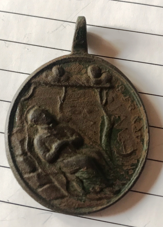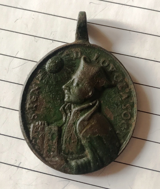 Доброго! Ієзуїтський католицький медальйон Ймовірно, 17-18 століття, зображено Св. Ігнация Лойолу та Св. Франциска Ксаверія (Ксавьєра). https://uk.m.wikipedia.org/wiki/Франциск_Ксав'єр Ймовірно, виготовлений на честь канонізації. Розмір Вашого 35х24 мм? З повагою,