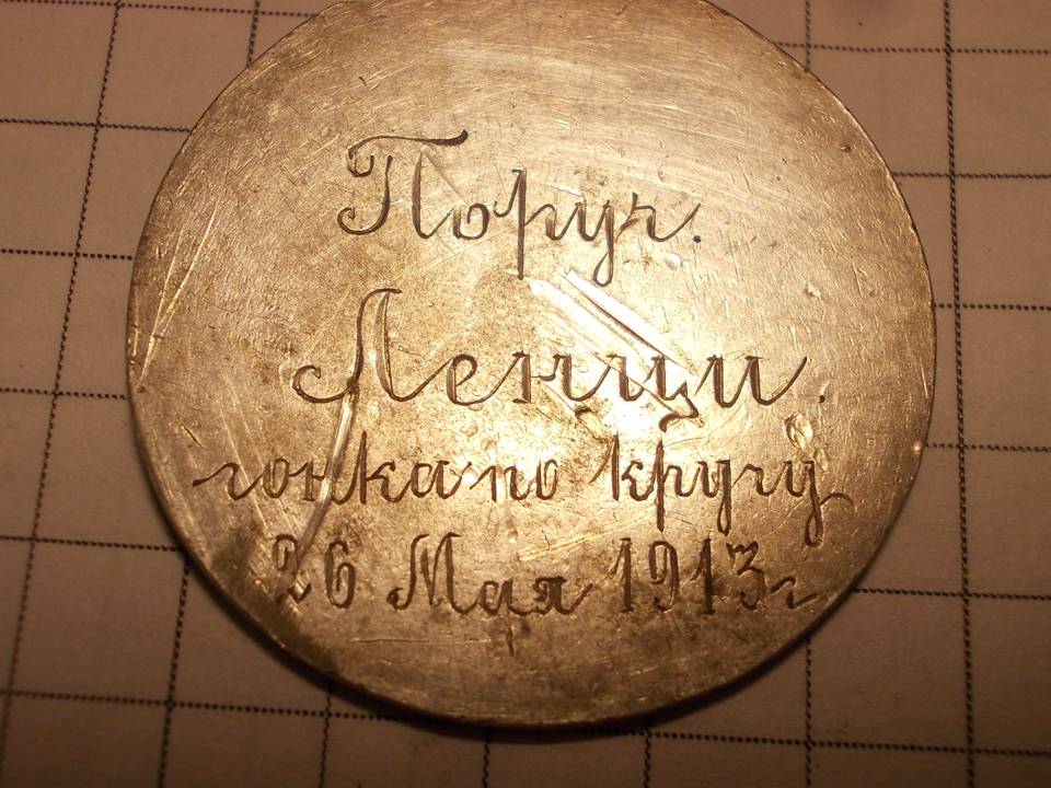 Спасибо за мнформацию! Может кто подскажет, какие полки воевали возле г. Дубно (находка оттуда) - это может помочь точнее определиться какой из двух Ленци потярял этот жетон. Если я правильно понимаю, жетон(?) не кустарной работы? Там не менее похожих фото или описания найти не удалось. Не думаю, что жетоны в серебре раздавали всем присутствующим на гонках.