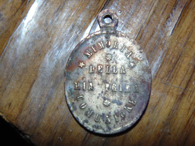 Да нет же - не общения а причастия! Это католический церковный медальон: "Памяти моего первого причастия" посмотрите напр. на е-бее http://www.ebay.it/sch/sis.html?_nk... mia prima comunione 034&_itemId=121562708511
