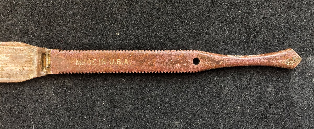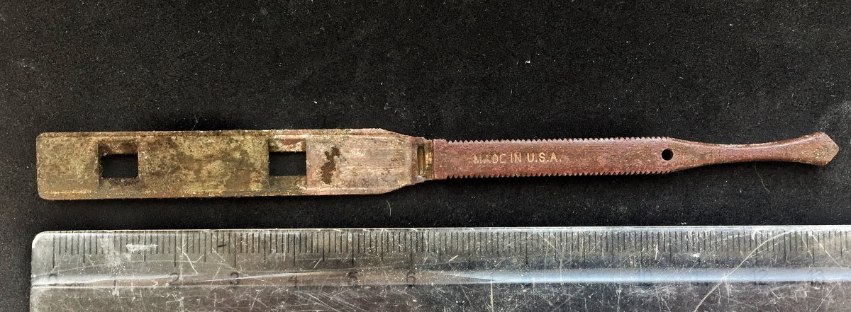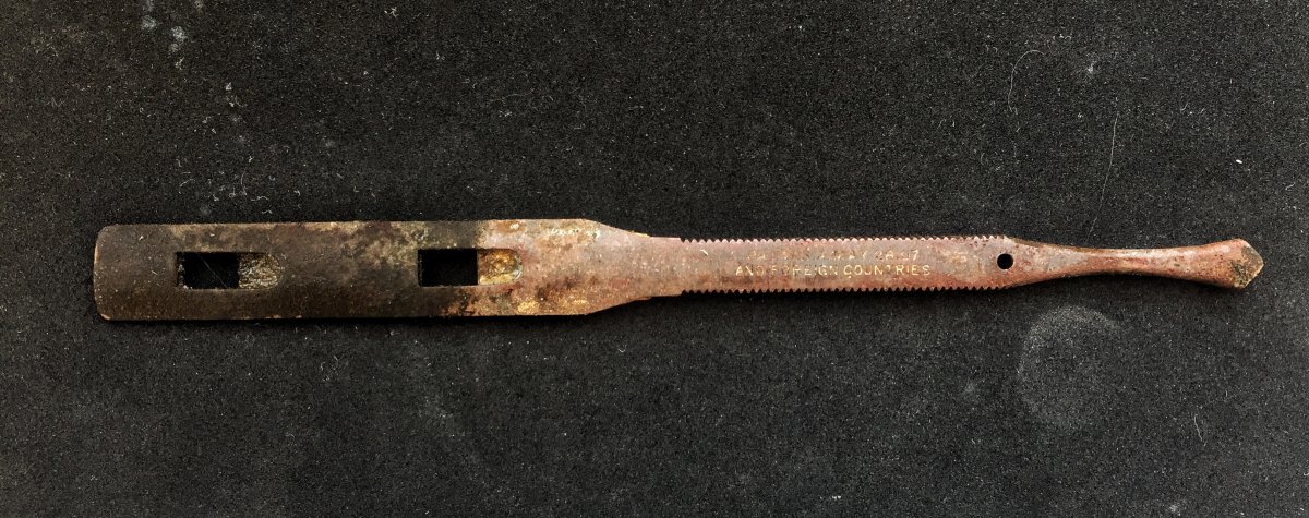 Здравствуйте, Уважаемые Эксперты! Попалась вот такая штуковина. Помогите определить и датировать предмет. Мне,напоминает бритву,но таких не видел. Буду благодарен за любую помощь. С ув.