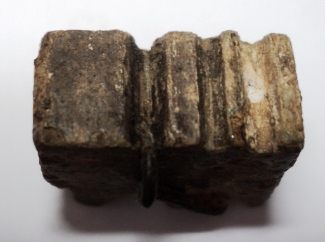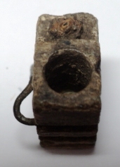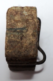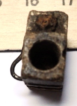 Выкопал такую детальку. Материал цинк, есть остатки железного винта. Скоба из упругой проволоки, по-видимому, фиксировала что-то, что вставлялось в отверстие. От чего эта деталь?