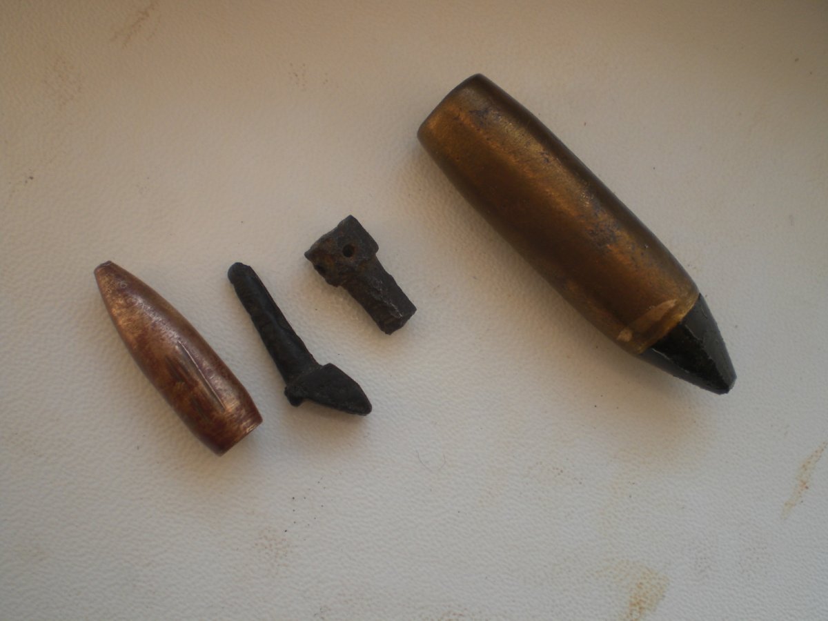 Доброго. 1- короткая с отверстием на наконечнике фото с гильзой 7.62 2- непонятно. 3- от пистолета? 4- интересная пуля нашел более 10 лет назад. Только руки дошли. Предположительно БЗ. На колпак не стоит обращать внимания, рукоблудный! 5-обойма к пятиколенному шомполу. Встречал такой, без определения.