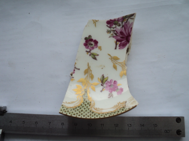 Подскажите по мелким непоняткам. Первая какая-то эмблемка. Вторая похоже на серебро, наверное брошь. Третья какая-то маленькая чашечка. Особо интересно от чего она? Четвертая какая-то висюлька в виде щита с картинкой на эмали и вроде как с иероглифом. Каких времен? Осколок блюдца, говорят по первой мировой. Так ли? И красивый шнурок. От чего?