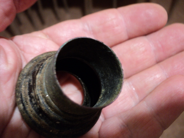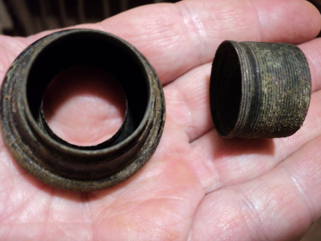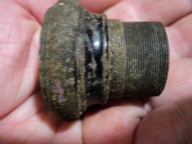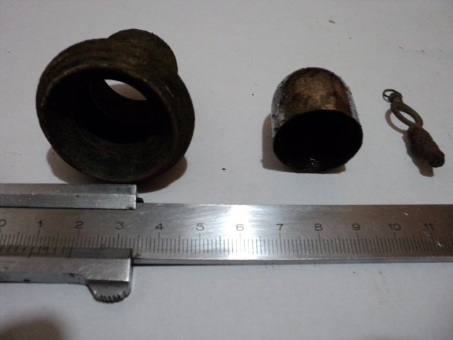 Вот сегодня вырыл эти непонятные мелкие штучки. Первая раскручивается материал медь с остатками черной краски. Может от фонарика? Вторая - толстостенный колпачок с резьбой. Материал медь или латунь с покрытием белым серебристым металлом. И третья, непонятно от чего.