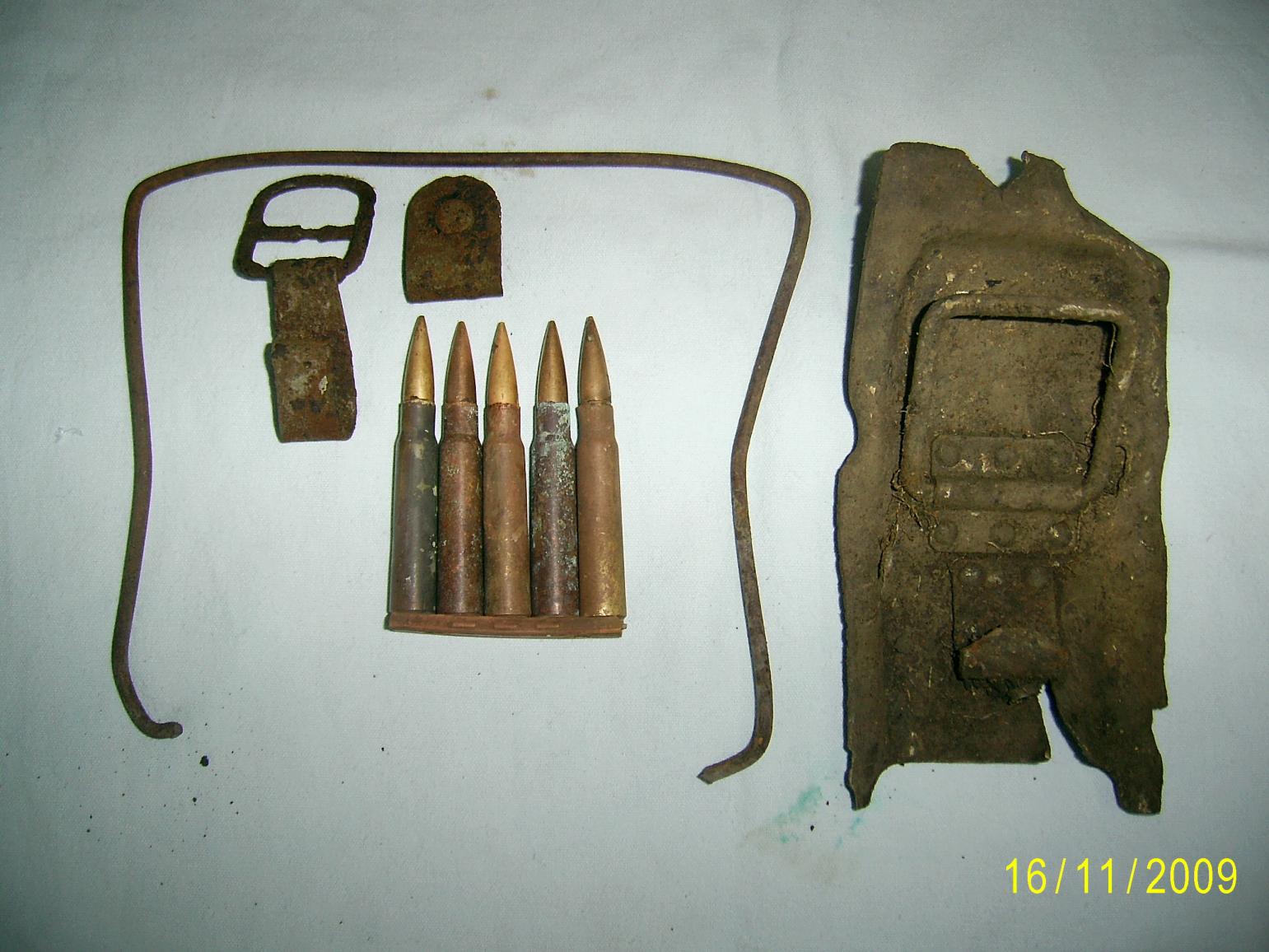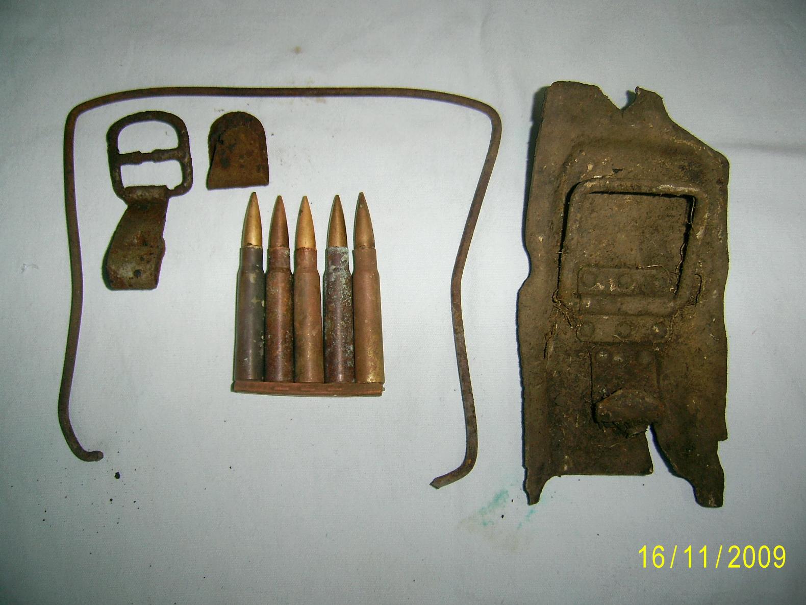 Пять ММГ патронов Маузер,пустые в планке,зацепы,зацеп от алюминий ящика от ленты на мг,ручка от ганс котелка.За все 30грн,возможно переводом на номер телефона,доставка на вас.