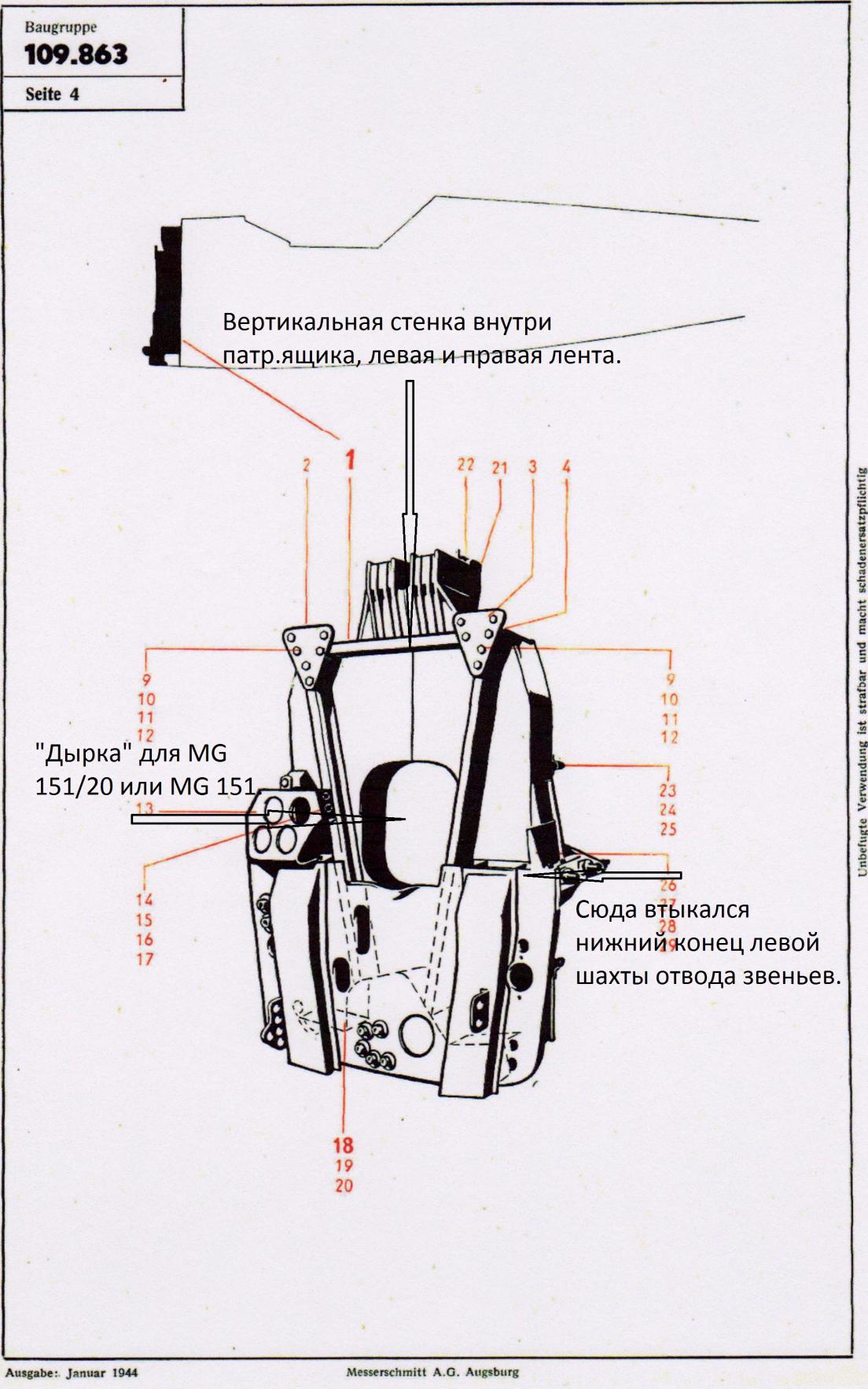 Re: Messerschmitt Bf-109 Ausf. "G" Картинки. 1. На первой картинке общие размещение пулеметов. 2. Картинка единого патронного ящика. Ящик прикручивался на лобовую стенку фюзеляжа. 3. Шахты отвода звеньев. 4. Картинка по шахтам отвода гильз и звеньев.