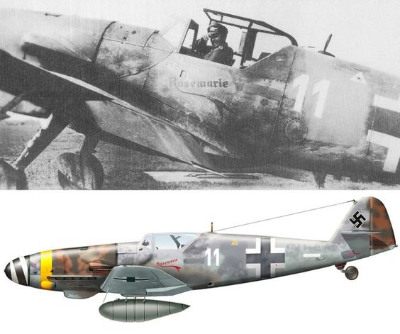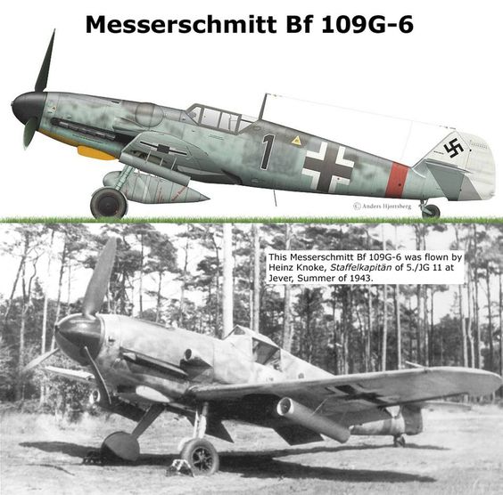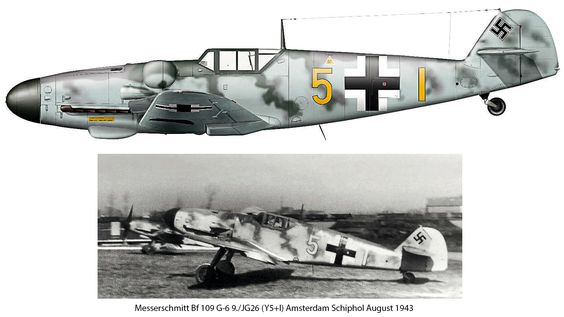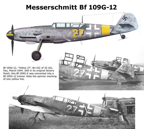 1 Messerschmitt Bf 109G-6. 2 Messerschmitt Bf 109G-14. 3 Messerschmitt Bf 109G-4. 4 Bf 109G-14/AS (W.Nr. 784993). Пилот Герберт Максис 13./JG 53 операция Bodenplatte. После аварийной посадки своего самолета вблизи Oberfelsberg, во время попытки выбраться из кабины самолета Максис был убит выстрелом в голову американским солдатом. 5 Messerschmitt Bf 109G-6. 6 Messerschmitt Bf 109G-6/U2. 7 Messerschmitt Bf 109G-6 (W.Nr. 411777) "Quex" 5./JG 52. Пилот Вальтер Вольфрум. Аэродром Громатиково(Крым). Март 1944 года. 8 Messerschmitt Bf 109G-6. 9 Messerschmitt Bf 109G-10/R3 10./J.G. 51. On the 4th of May around 3pm a Messerschmitt Bf 109G marked "Yellow 5" landed at the Bulltofta airfield outside Malmoe in the south of Sweden. It was flown by Oberfeldwebel Horst Walter Petzschler from Jagdgeschwader 51. His unit, the 10thstaffel, was based at a temporary airstrip in the west of East Prussia, near Danzig. 10 Messerschmitt Bf 109G-2/R2 Trop.