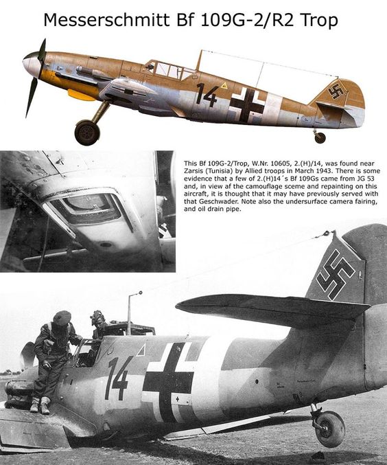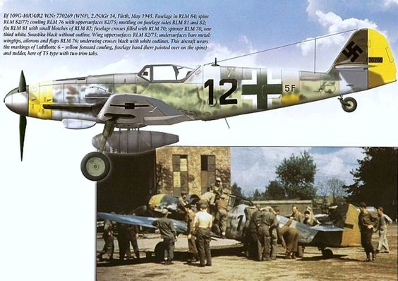 1 Messerchmitt Bf 109G-2 of the Kommodore of JG 3 Wolf-Dietrich "Fürst" Wilcke at Morosovskaya in December 1942. 2 Messerschmitt Bf 109G-2/R2 Trop "Black 19". La Marsa(Tunisia) March 1943. 3 Messerschmitt Bf 109G-2/R2 of Herbert Prior of 2(H)./Aufklarungsgruppe 14 is being inspected by british soldiers at Qued-Zarga in Tunisia, April 1943. On 7 April 1943 Herbert Prior of 2.(H)/14 took off in this aircraft on his 101st war mission, carrying out a tactical reconnaissance mission when he was shot down by anti-aircraft fire and captured by Allied forces. 4 During an attempt to land in Switzerland, Siegfried Henning of Stab III./JG 3 crashed his Messerschmitt Bf 109G-14 (W.Nr. 262818) in a water ditch near Affeltrangen, Thurgau, on 17 December 1944. The plane was incorporated into Fligerkompanie 7, Flugwaffe (Swiss Air Force) as "J-714". 5 Messerschmitt Bf 109G-14 of 15./JG 5 photographed at Lister(Norway) in May 1945. 6 Messerschmitt Bf 109G-6 Trop. 7 Messerschmitt Bf 109G-10/U4 "Rosemarie" belonging to II./JG 52. Photographed at Neubiberg airfield. 8th May 1945. 8 Messerschmitt Bf 109G-10(WNr. 151567) "White 13" JG 300. Wunstorf. 13 April 1945. 9 Messerschmitt Bf 109G-10U4/R2(W.Nr. 770269). Furth 1945. 10 Messerschmitt Bf 109G-2 6./JG54. Eastern Front 1942.