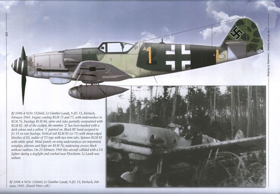 1 Messerschmitt Bf 109 K-4 (W.Nr. 332529). Stab/JG 52. 2 Messerschmitt Bf 109K-4/R3(W.Nr. 330230) 10./JG 77. December 1944. 3 Messerschmitt Bf 109K-4(W.Nr. 332579) of 10./JG 53. 4 Messerschmitt Bf 109K-4. 5 Messerschmitt Bf 109K-4 of 9./JG 3. 6 Messerschmitt Bf 109K-4(W.Nr.33660). 9./JG 53. Kirrlach 1945. 7 Messerschmitt Bf 109K-4. 8 Messerschmitt Bf 109K-4 11./JG3. 9 Messerschmitt Bf 109K-4 из состава 12./JG27. Найден недалеко от Праги. Май 1945г.