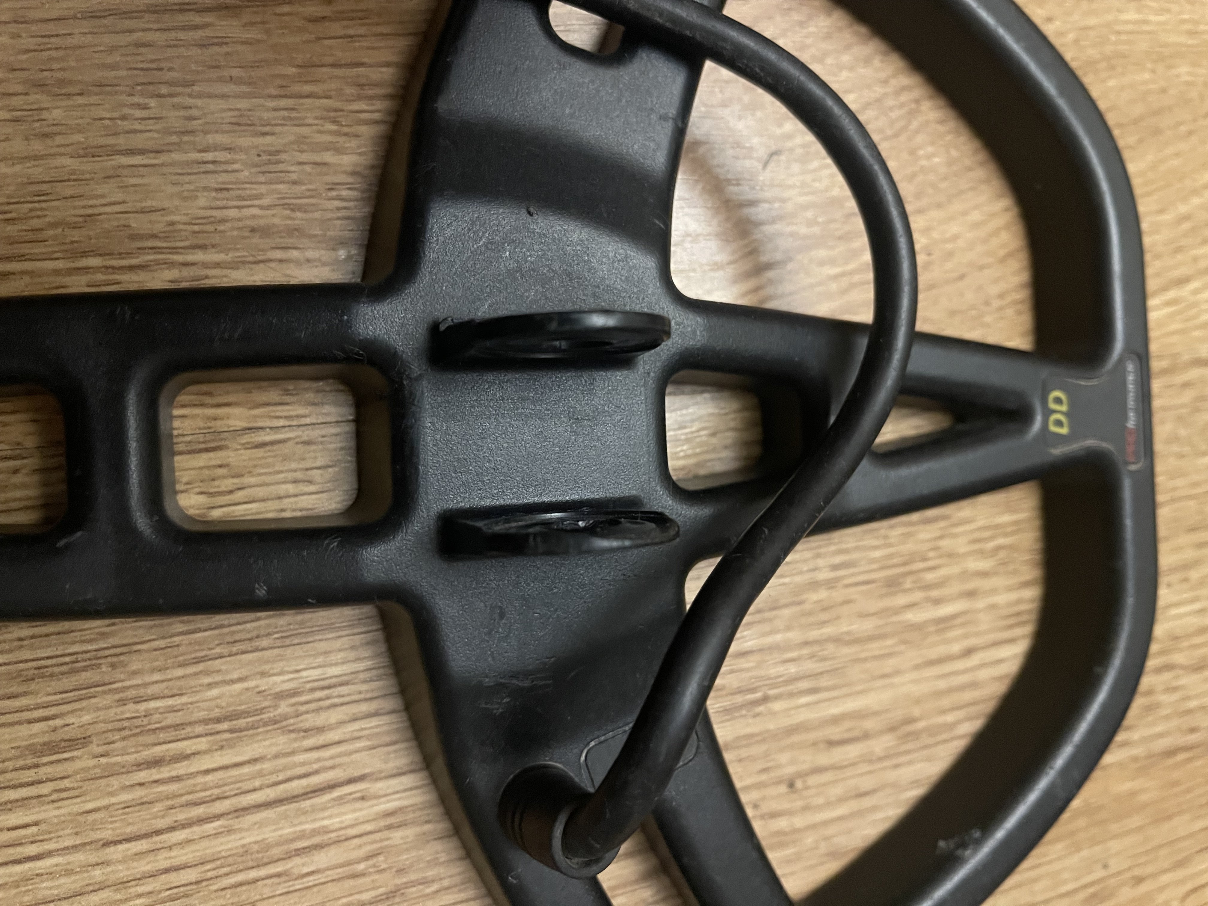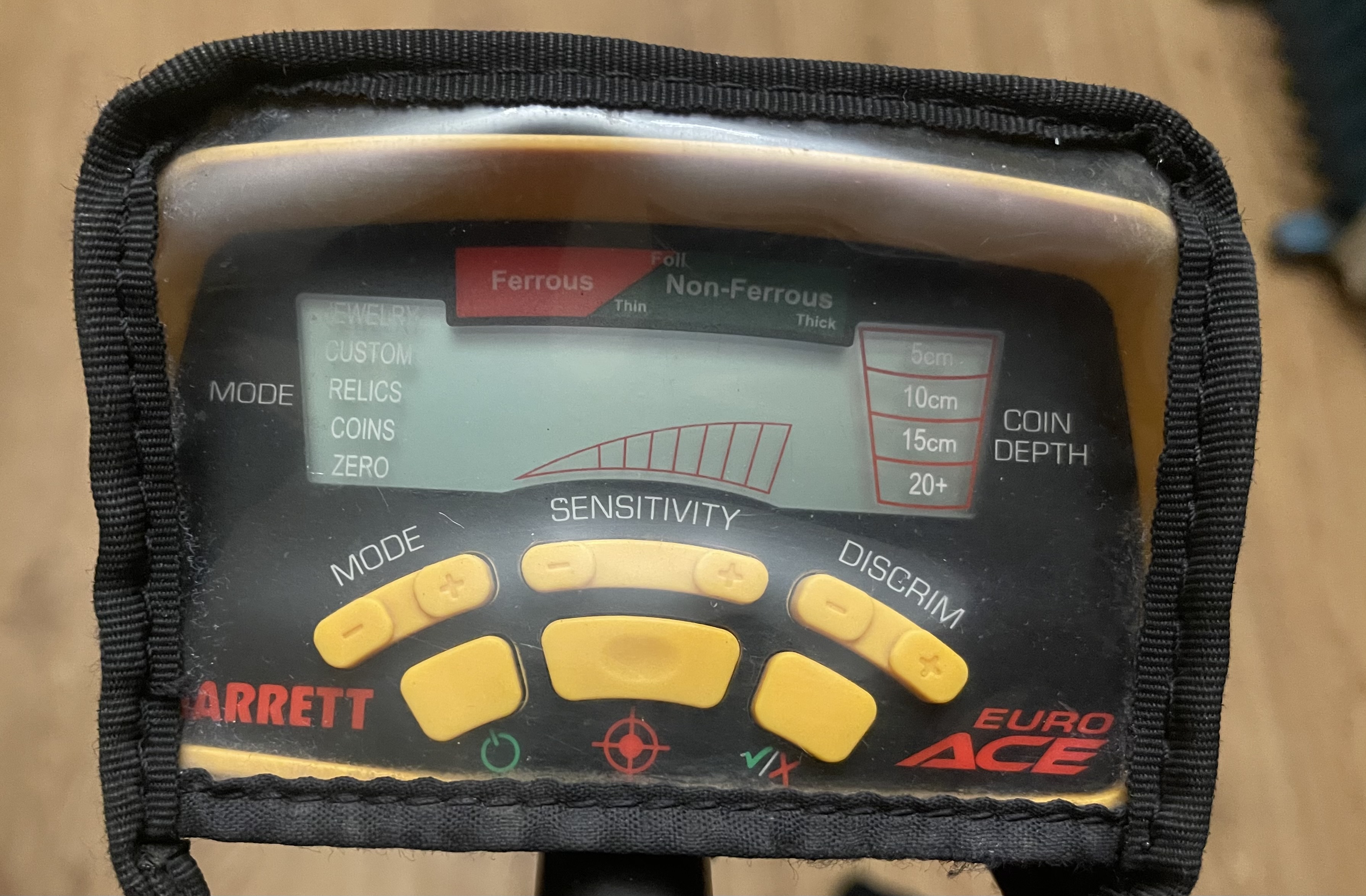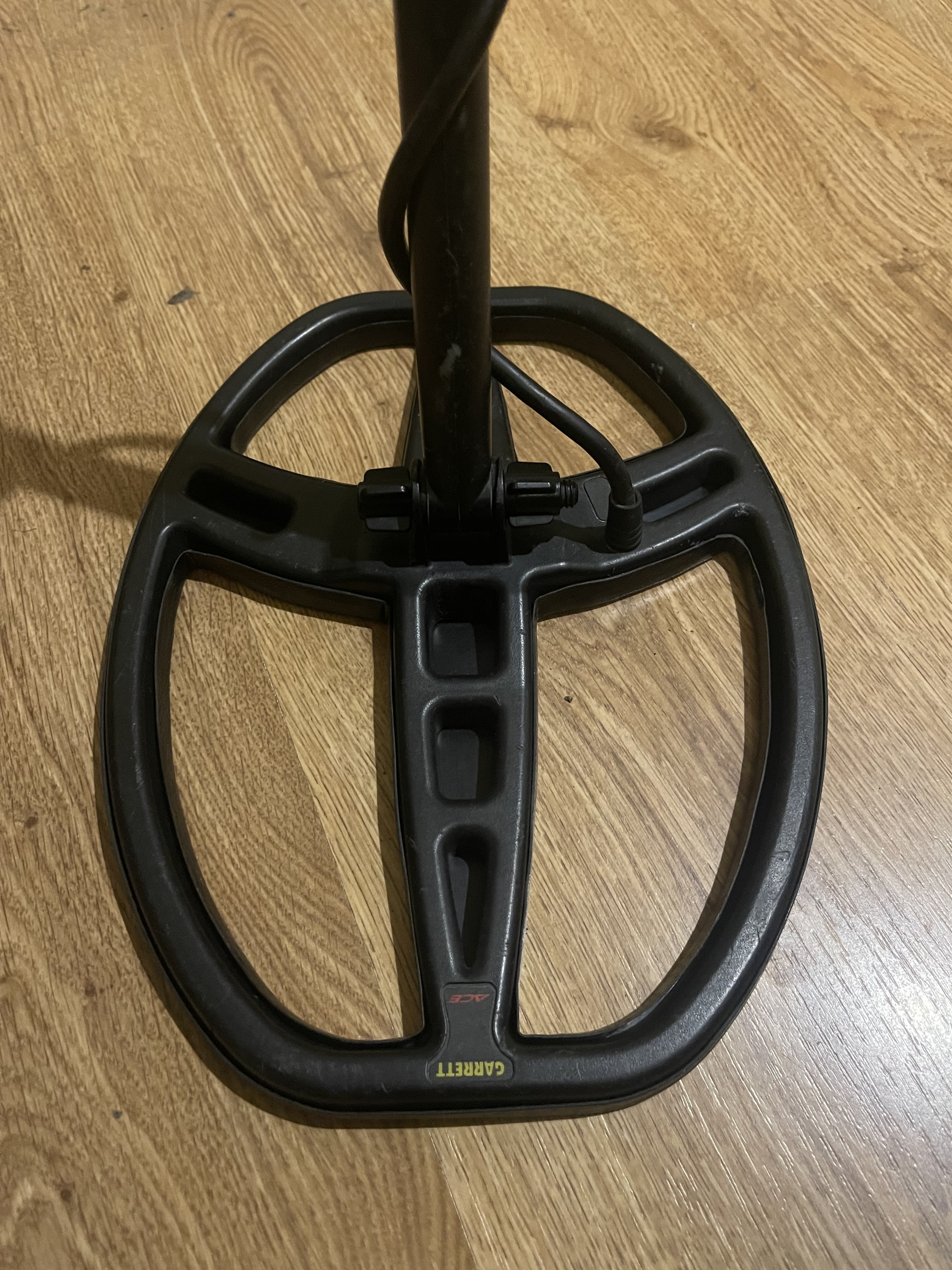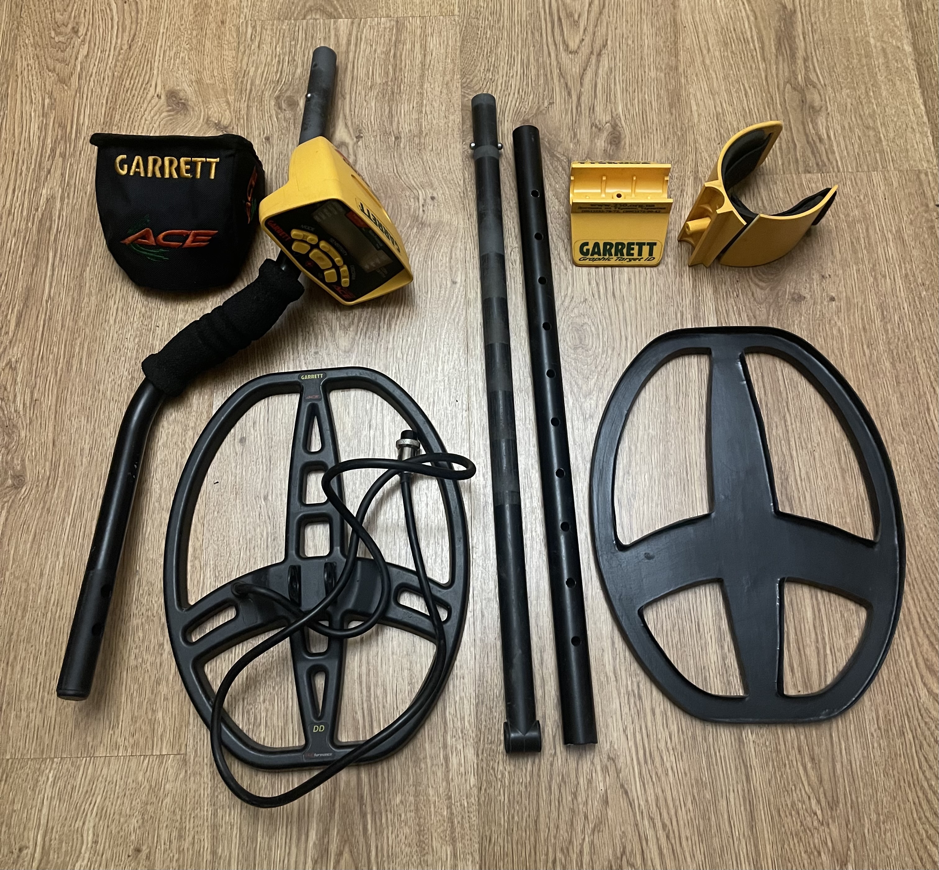 Металлоискатель Garrett EURO ACE Защита катушки и чехол на блок, дополнительный болт с наружными резиновыми прокладкам +. Заменены внутренние резиновые прокладки в месте крепления катушки к штанге. Блок, катушка, штанга рабочие. Недостатки: Сломано крыло подлокотника; Надрыв резиновой оплетки провода в месте его соединения с катушкой (внутренние провода без повреждений); Износ ушей катушки (не критично). Продан.