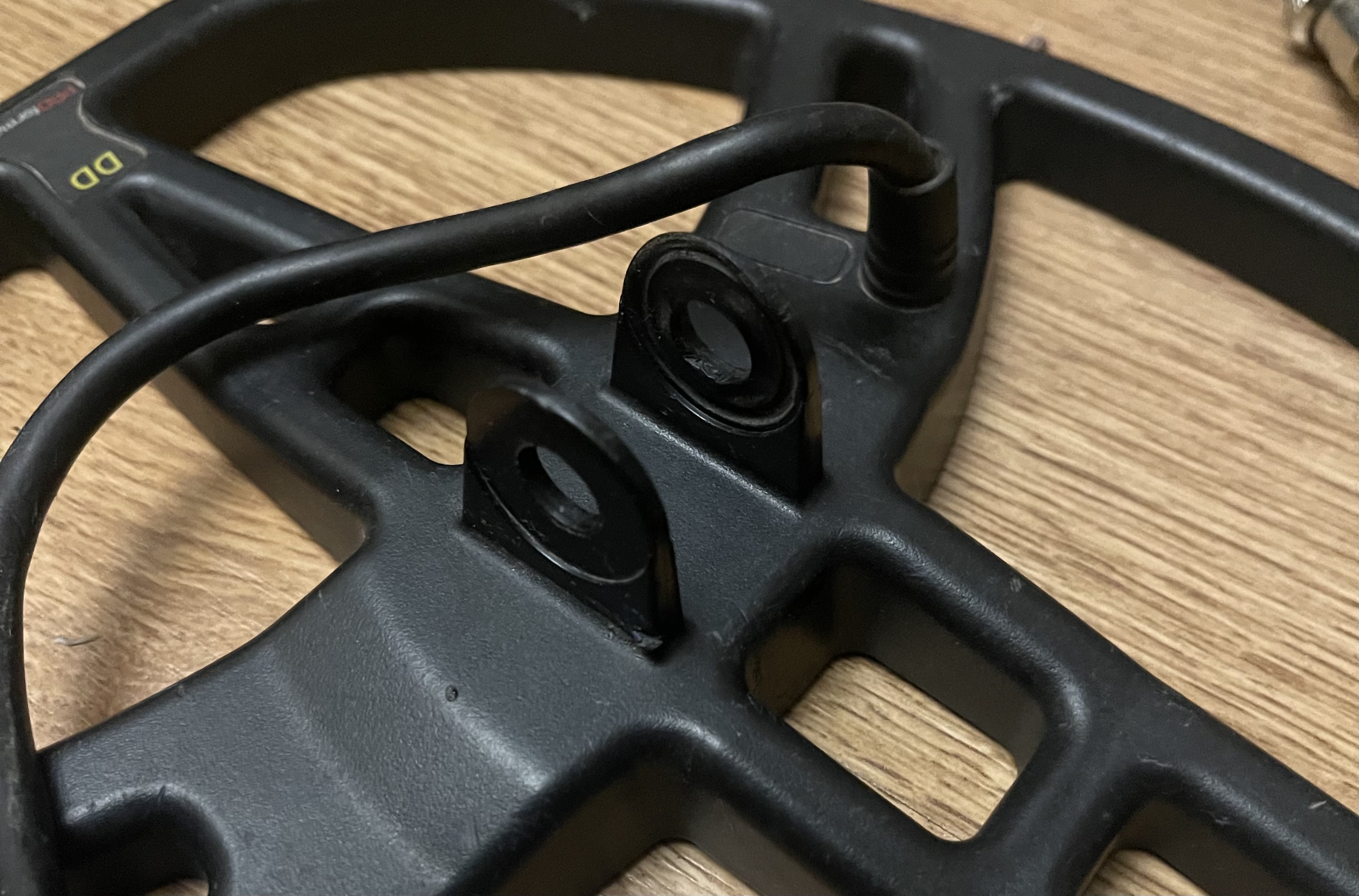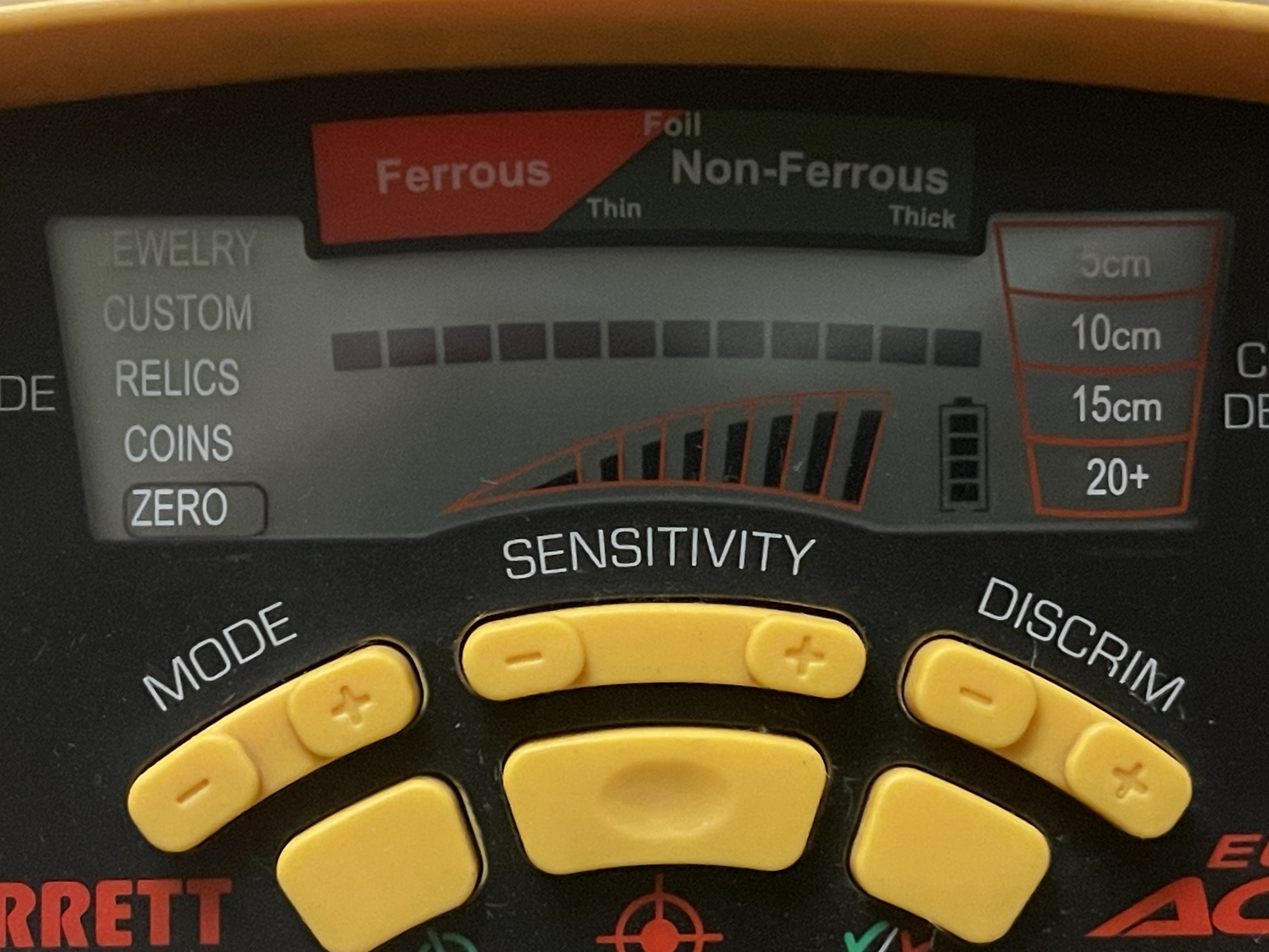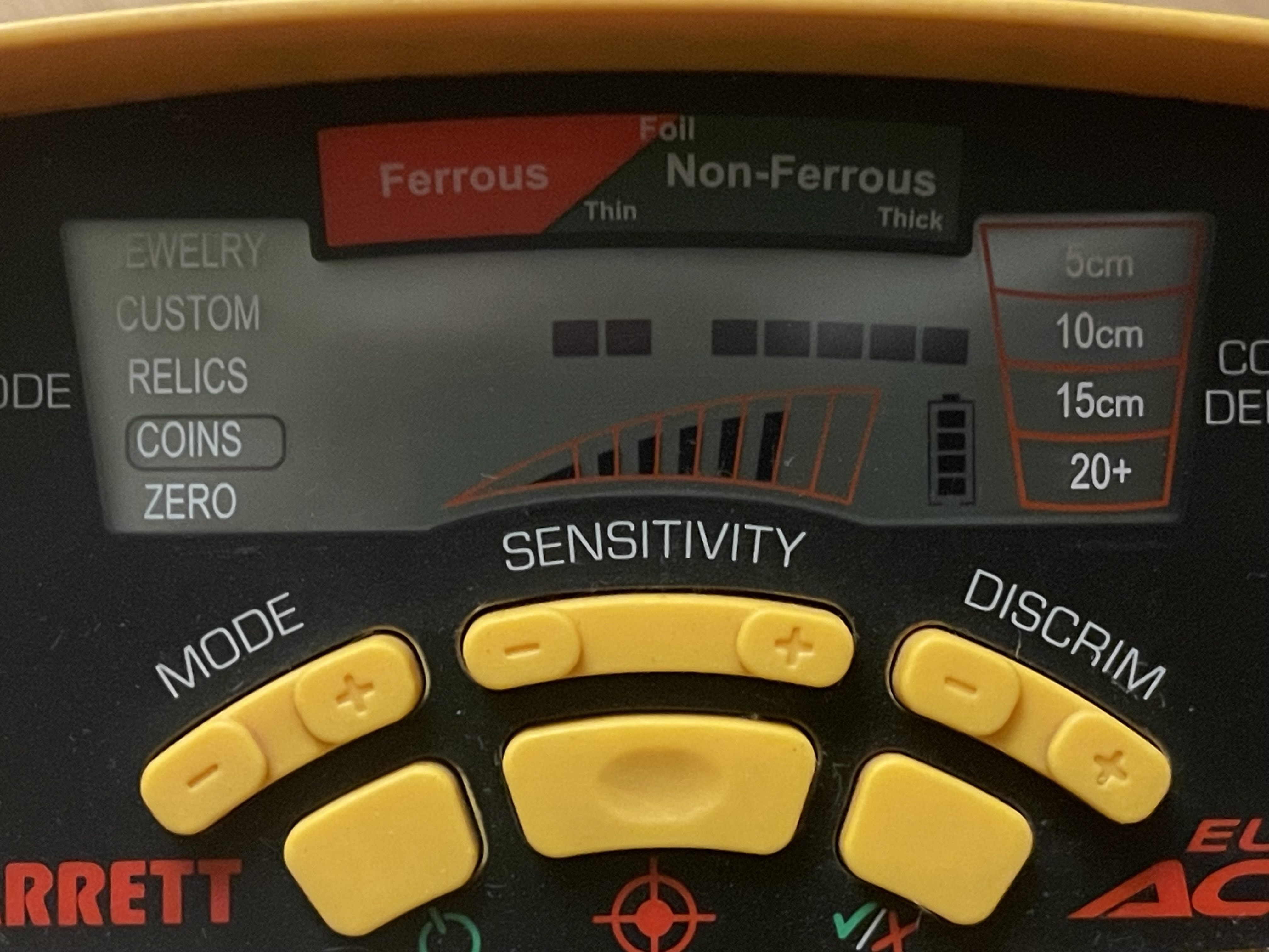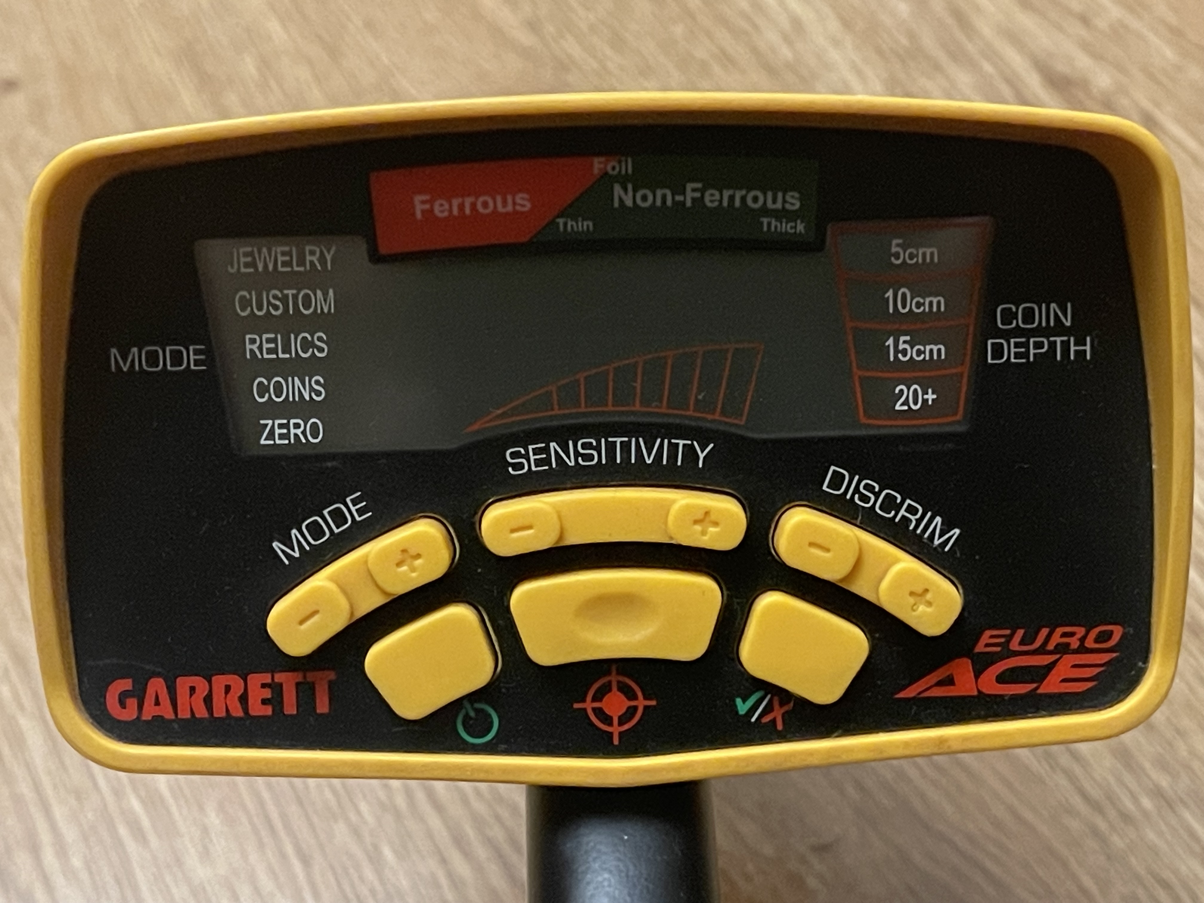 Металлоискатель Garrett EURO ACE Защита катушки и чехол на блок, дополнительный болт с наружными резиновыми прокладкам +. Заменены внутренние резиновые прокладки в месте крепления катушки к штанге. Блок, катушка, штанга рабочие. Недостатки: Сломано крыло подлокотника; Надрыв резиновой оплетки провода в месте его соединения с катушкой (внутренние провода без повреждений); Износ ушей катушки (не критично). Продан.