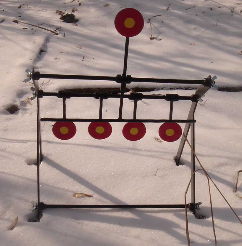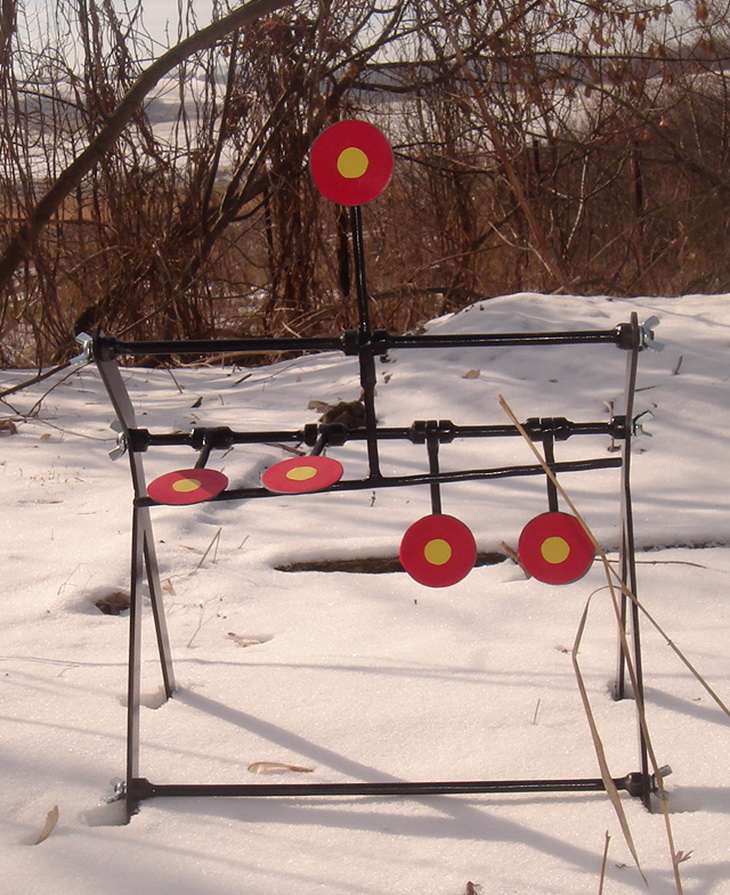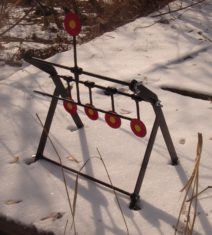 Предлагаю механическую мишень для пневматики в кал. 4.5мм Габариты: в собранном состоянии выс. - 47см, шир. - 36см в разобранном - 25см х 36см Пятаки-мишени из металла - 2мм Боковые стоики - полоса 25 х 3 Оси - прут диам. 8мм Вес - 1.95 кг На лицевой стороне мишени - самоклеющаяся пленка. Для сборки-разборки не требуется ключей. Конструкция прочная. При желании, можно закреплять саморезами на столешнице. Цена - 350 грн. Предложения, пожелания в личку... Принцип работы на видео из youtube..