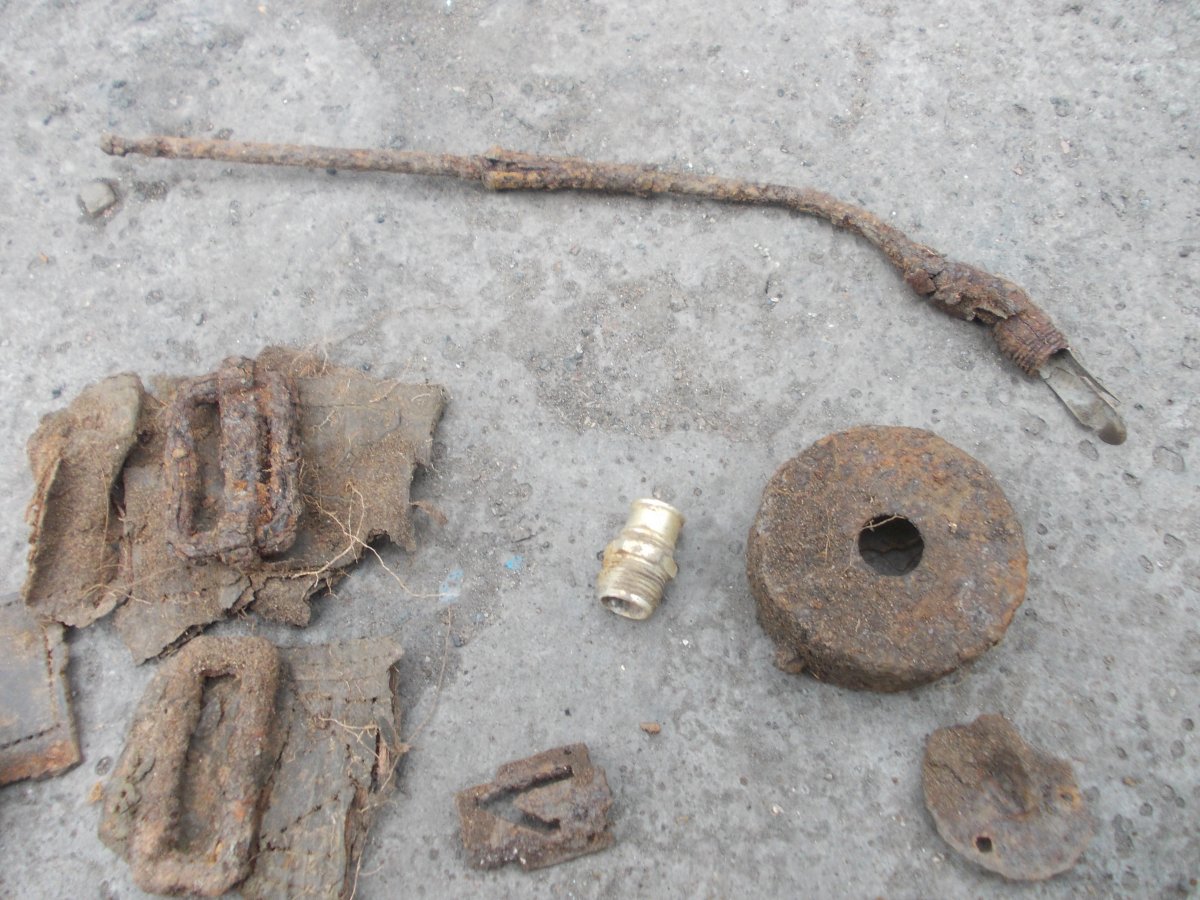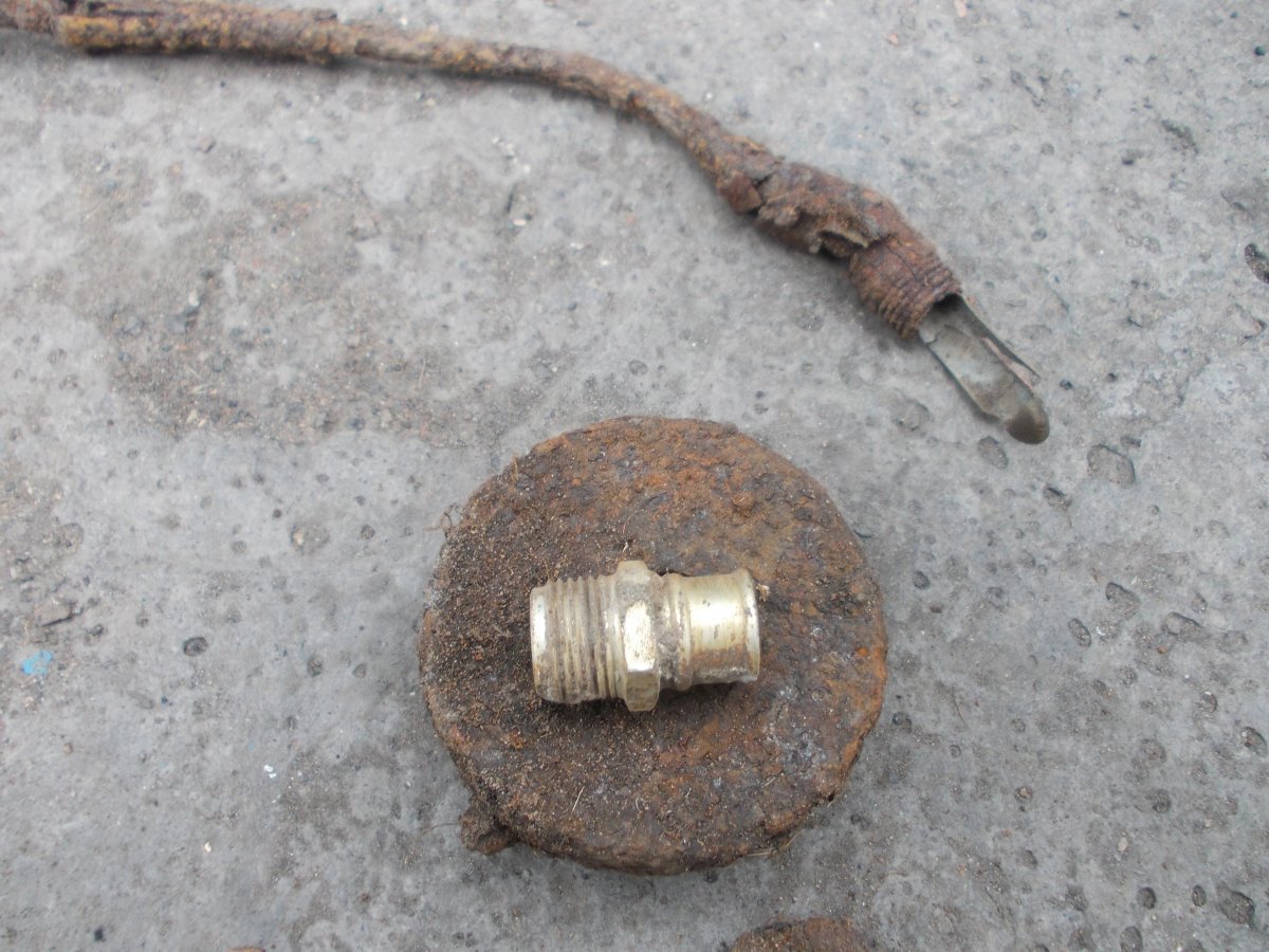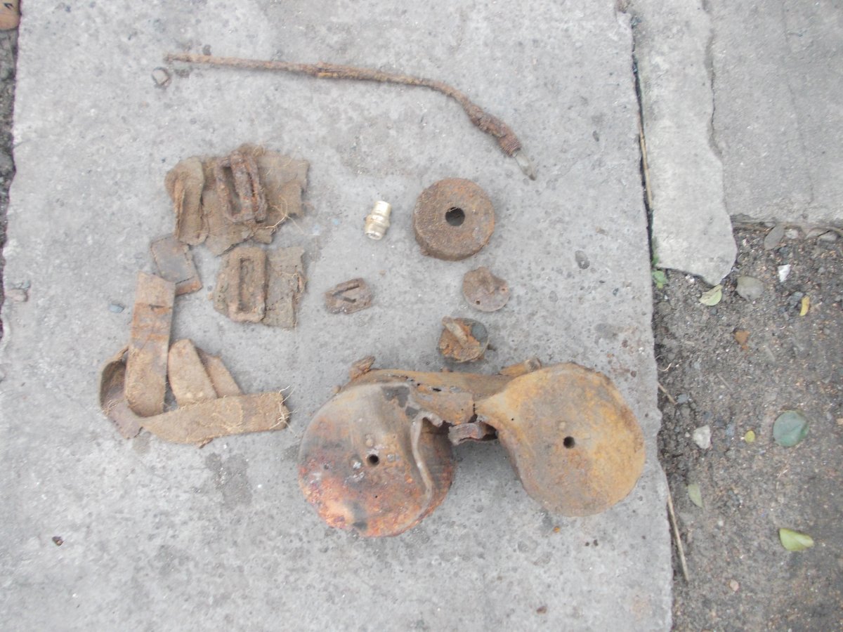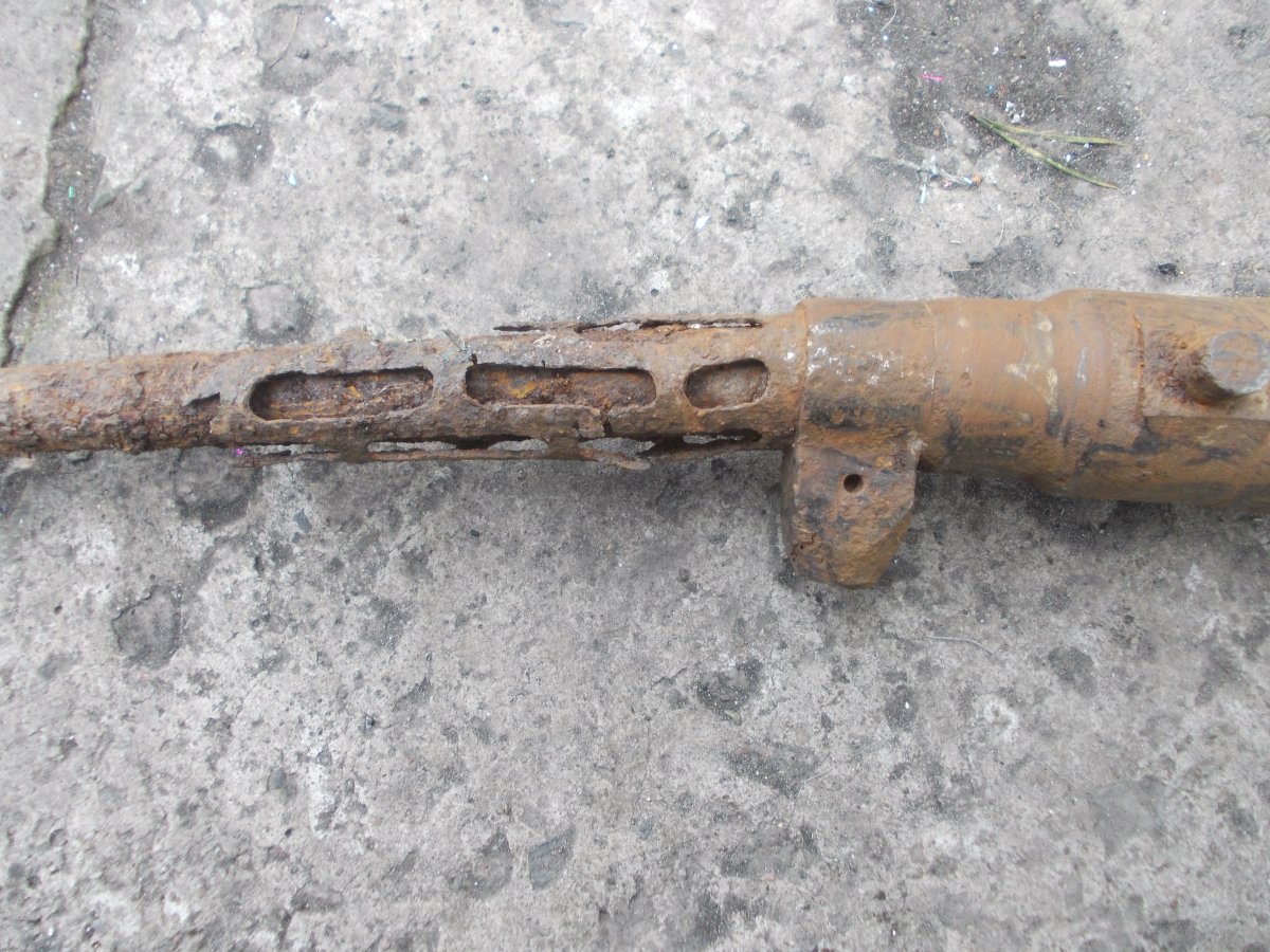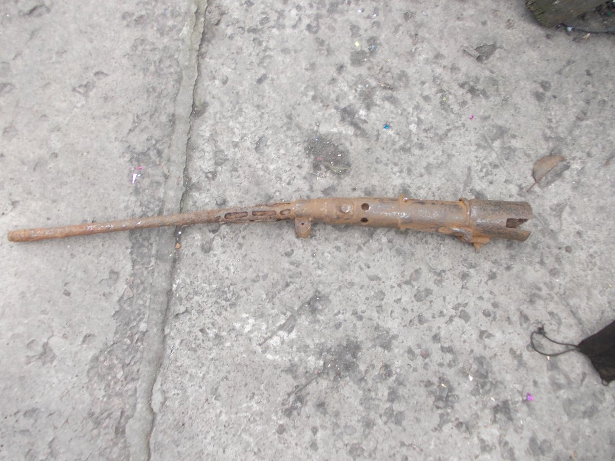 Уважаемые коллеги! Вот вчера копнули гнездо.Настрел и запчасти,а рядом,в метре вертикально стояло,думал труба,заземление,а раскопал МГ.по инету МГ 15?Ствол,конечно хлам,вниз стволом стоял,а коробка.как ее правильно? в хорошем состоянии.Не чистил,почти,клеймо сразу увидел,были такие с якорями?или это не якорь?Мне не надо,буду продавать.или в металлолом?Да,и среди остального есть от него что?Интересует алюминька.А то антена?длинная.