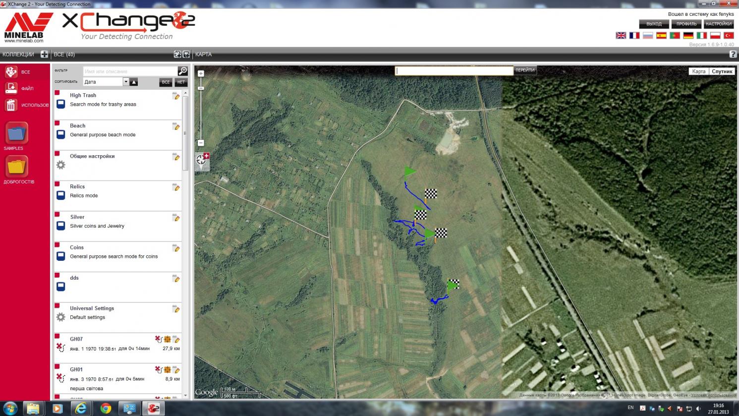 Вот как выглядит запись "GPS трекера" .... зеленый флаг начало записи, шахматный,- конец записи. В самом софте XChange 2, Вы уже можете на трекер прицепить свои находки или прицепить точку (к примеру ...где нашли складировку ВОПняка, и чтоб к предкам никто с любопытных не улетел, скидываете координати с точкой .... к примеру на сайт МНС). Прицемить место с находкой можно и прямо в металодетекторе, находясь возле места самой находки!!!... но увы, ...как и писал выше, пока что я на приборе этим не занимался.