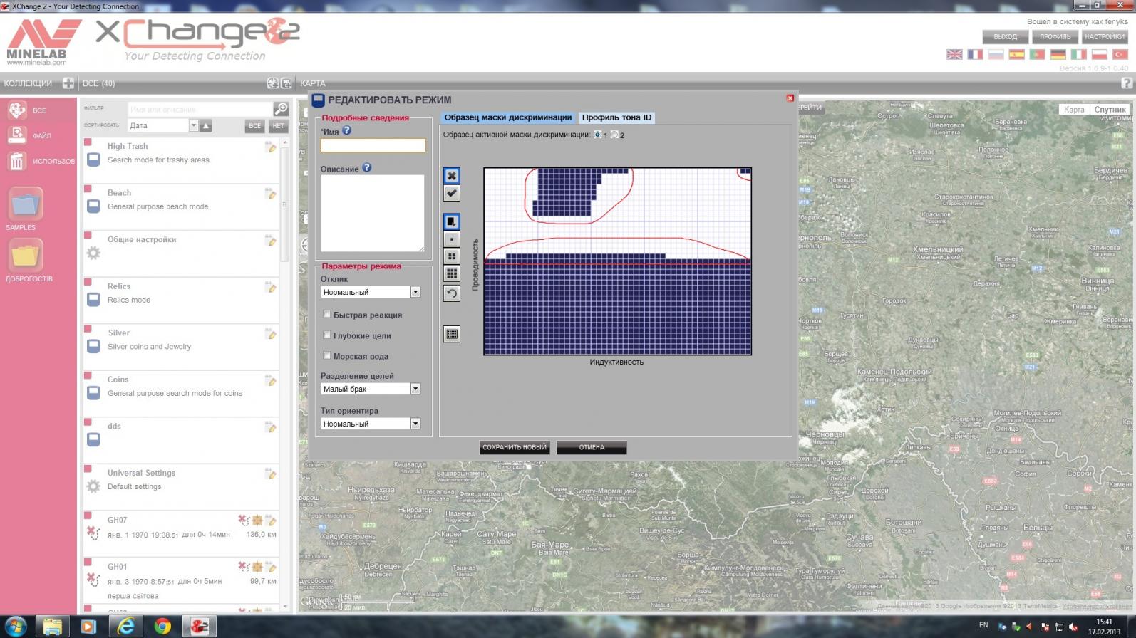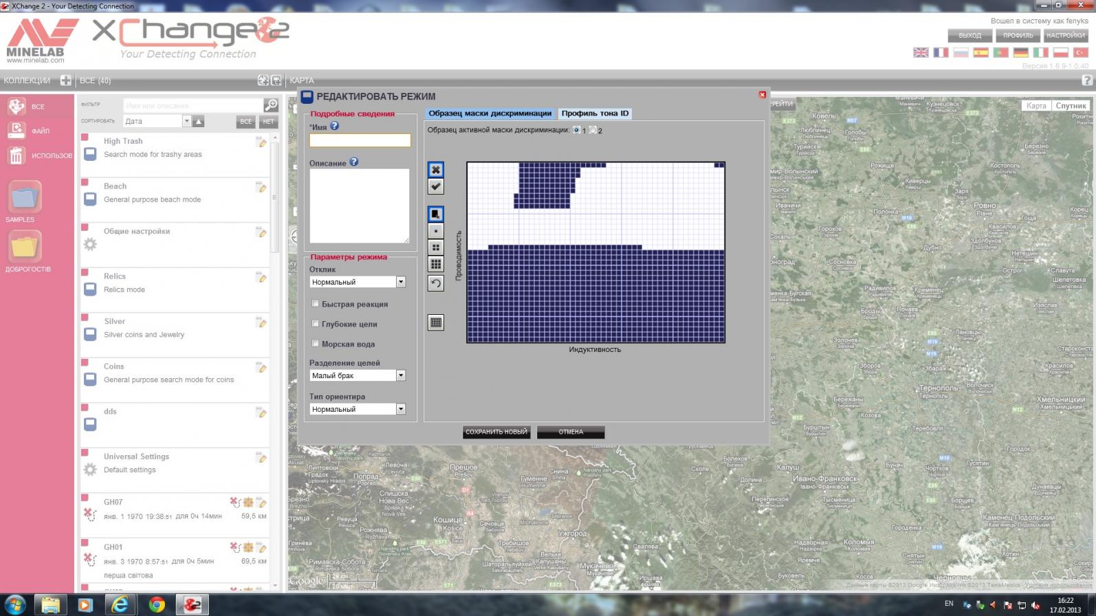 Раскажу кое что, о удобности настройки СТХ в програме XChange 2: ....возможно повторюсь ....что сам CTX3030, что сама программа XChange 2, в настройках переключаються на РУССКИЙ язык!!! Все мы знаем о неособо удобном процессе тыркаья кнопок на детекторе, чтоб создать свою маску дискриминации, отклики , разделение и т.д. Кроме заложеных, в СТХ штатных масок, можна создать с нуля полностью свою маску, и не одну!!! При создании "своей"маски по умолчанию в XChange 2 выводиться вот такой экранчик ...