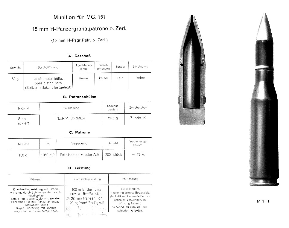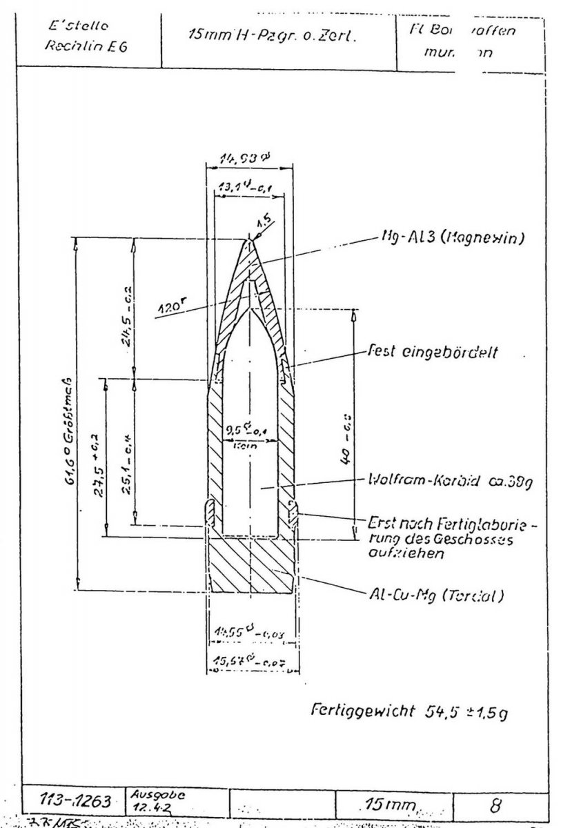 "15mm H.-PzGr. Patr. o. Zert - 15-мм подкалиберная бронебойная пуля с карбид-вольфрамовым сердечником, без самоликвидации, к немецкому авиационному пулемёту MG 151/15". Как-то так....
